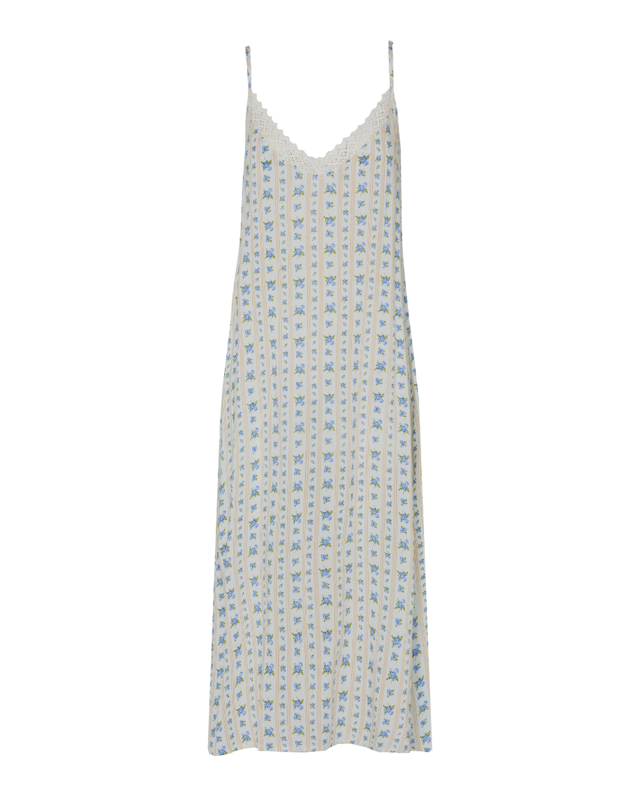- Camisón gala largo con escote en V y tirantes cruzados en la espalda. Detalles bordados en escote y espalda. Tejido de modal estampado con rayas naranja y flores en tonos azules y verdes.