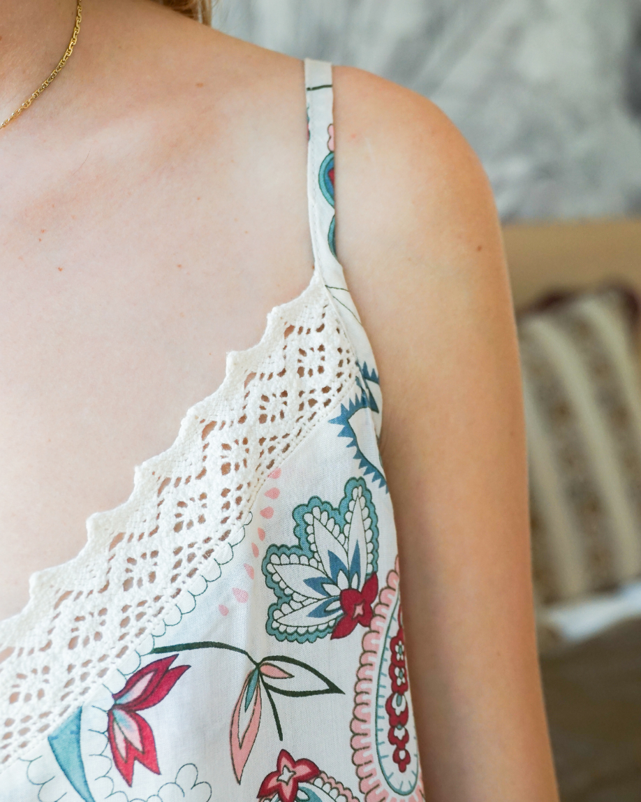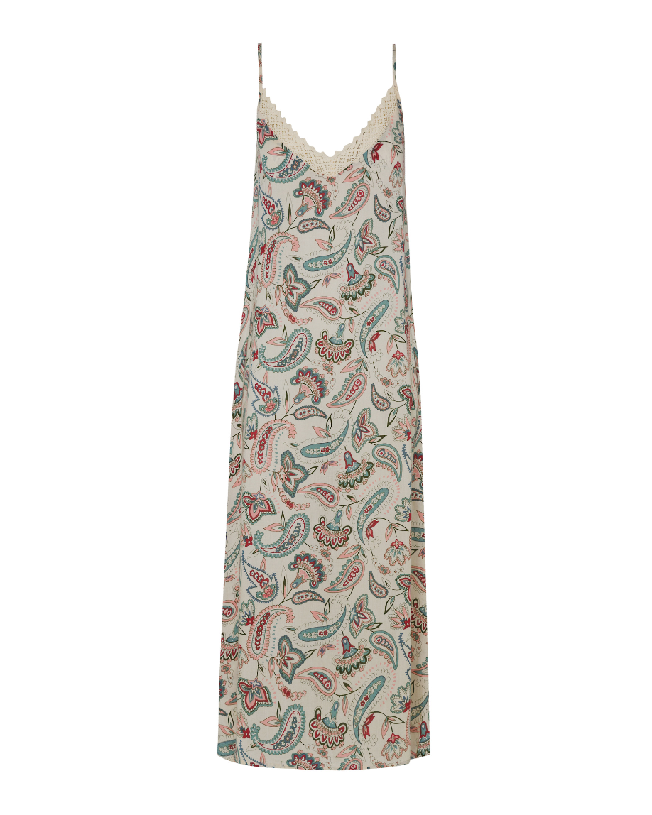 - Camisón gala largo con escote en V y tirantes cruzados en la espalda. Detalles bordados en escote y espalda. Tejido de modal estampado en cachemira en tonos rosas y azules.