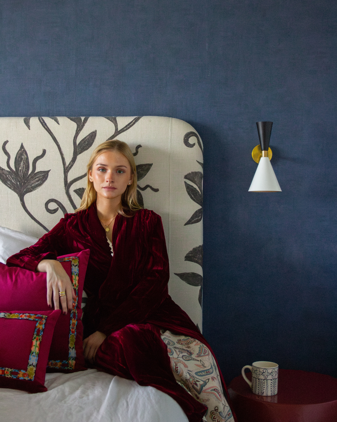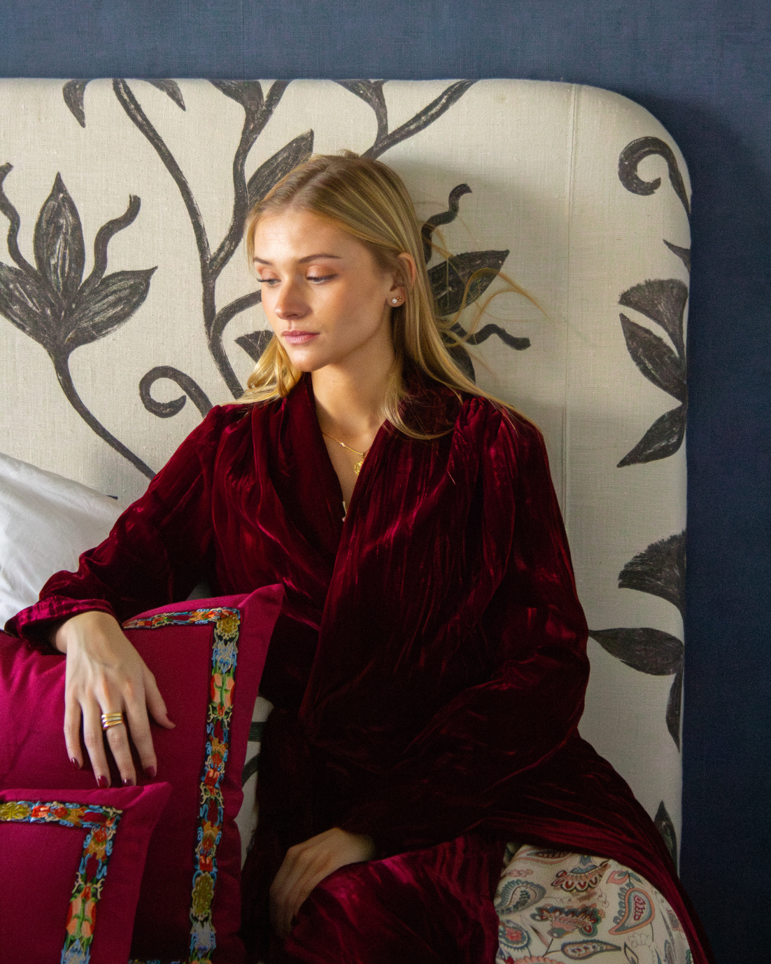 - Bata envolvente de terciopelo en color burdeos con hombreras. Detalle fruncido en hombro y manga larga. Cierre con lazada. Disponible también en color verde y azul.
