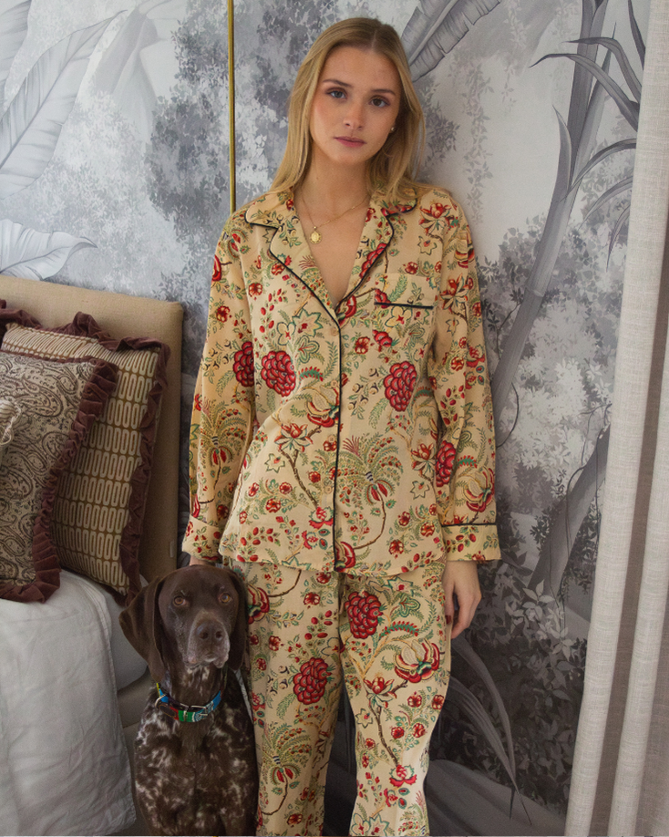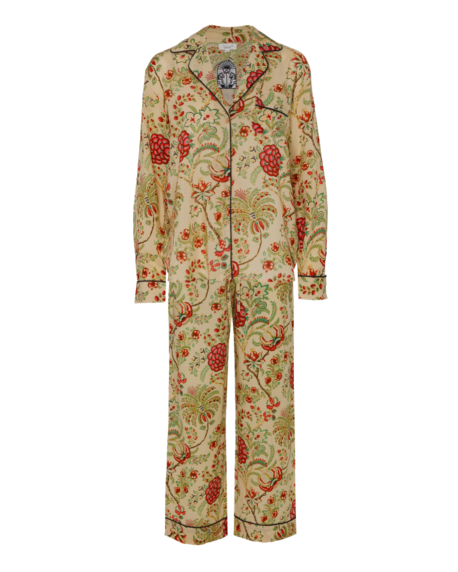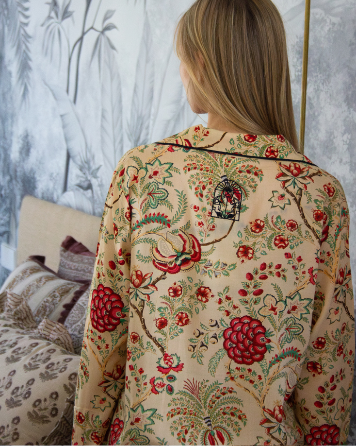 - Conjunto de pijama de camisa y pantalón largo de modal. En estampado floral en tonos rosas con ribete en color negro y bolsillo. Logo bordado en la espalda.