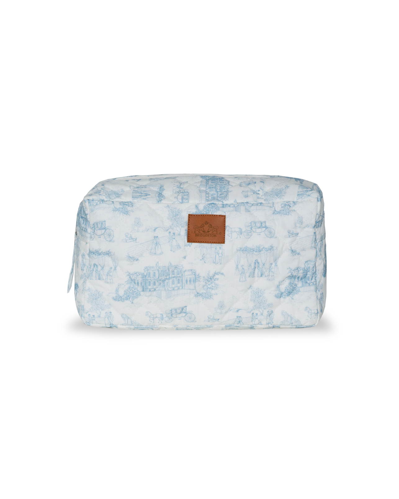 - Neceser de tamaño grande confeccionado en algodón 100% acolchado, con estampado toile de jouy exclusivo de Los Bridgerton en tonos blanco y celeste. Con un exterior suave y acabado resinado, que facilita la limpieza y ofrece mayor resistencia. Detalle de etiqueta con el logotipo de la colaboración. Medidas: 28x18x7 cm.