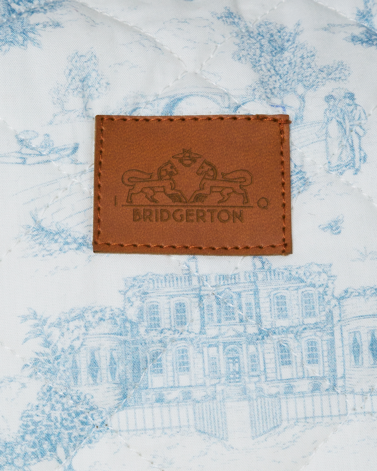 - Neceser de tamaño mediano confeccionado en algodón 100% acolchado, con estampado toile de jouy exclusivo de Los Bridgerton en tonos blanco y celeste. Con un exterior suave y acabado resinado, que facilita la limpieza y ofrece mayor resistencia. Detalle de etiqueta con el logotipo de la colaboración. Medidas: 20x14x4 cm.