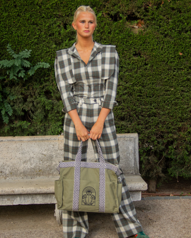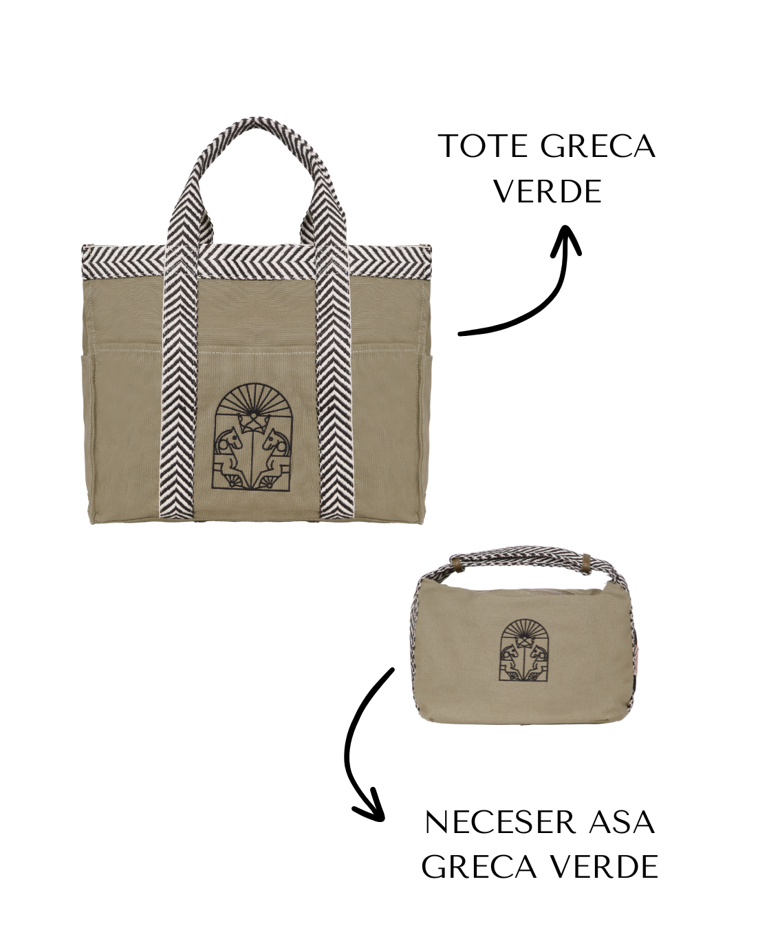 Pack de Tote y Neceser de asa con greca en color verde.