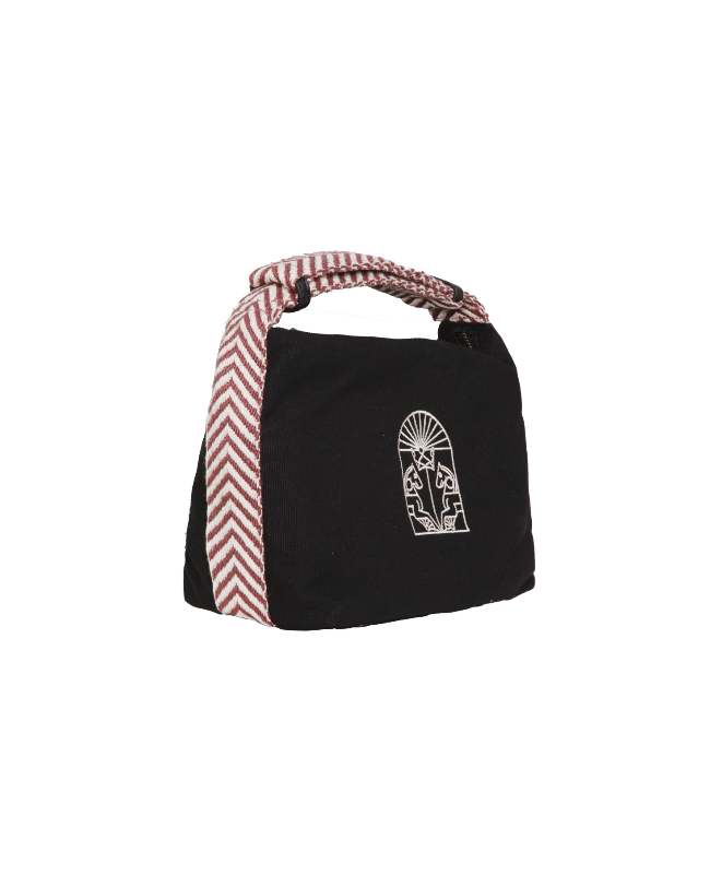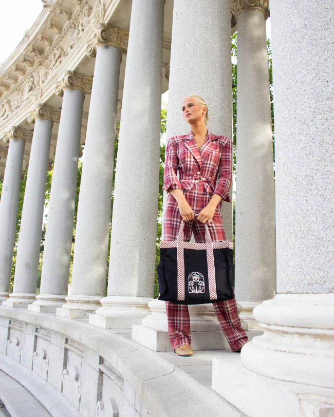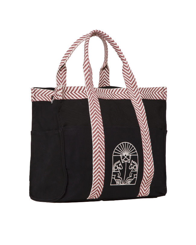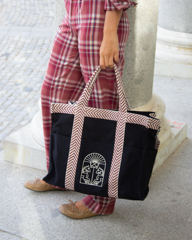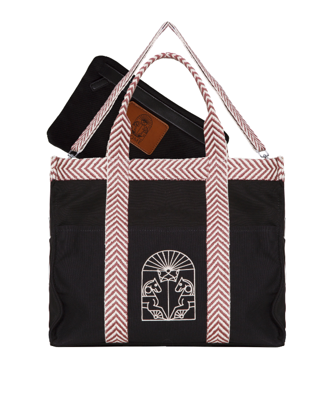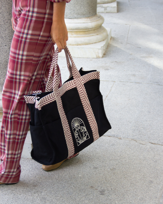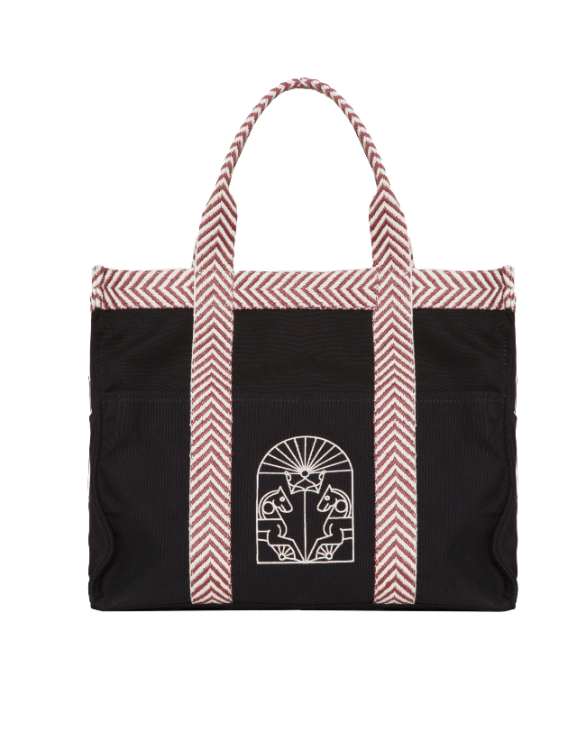 - Bolso tote negro cuadrado con asa con greca decorativa en color beige y burdeos. Logo bordado en beige. Incluye un bolsillo interior extraíble. Disponible en color verde y negro. Fabricado en canvas de algodón.
