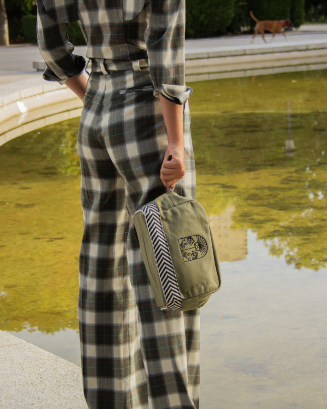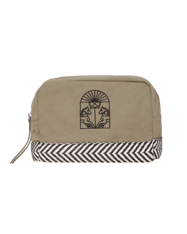 Neceser rectangular verde con cremallera y detalle de greca beige y negro. Logo bordado en color beige. Disponible en color verde y negro.