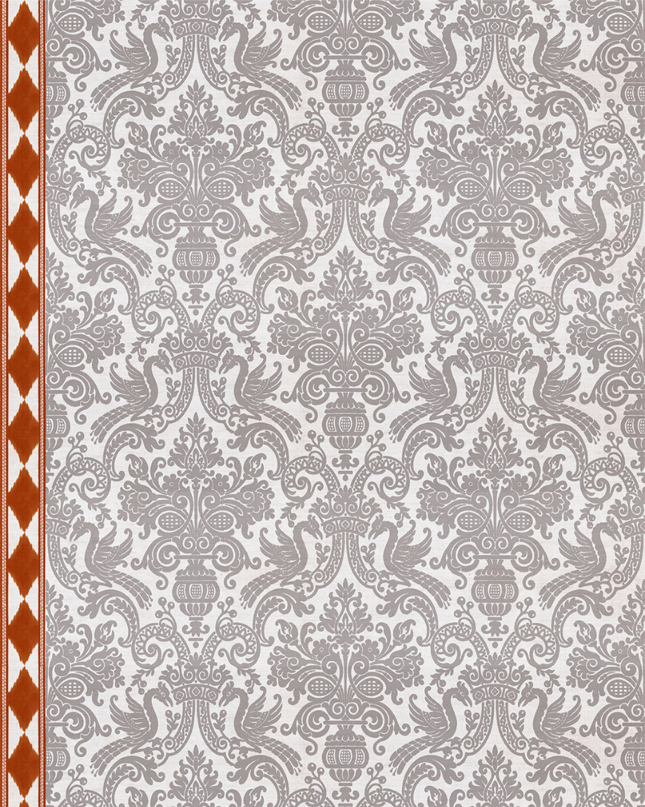 ELENA TEJA es un papel pintado de una hermosa trama caleidoscópica de tono taupe, que fusiona elementos clásicos como los leones palaciegos con una guarda étnico, diseño en colaboración con Carolina Colomba.
