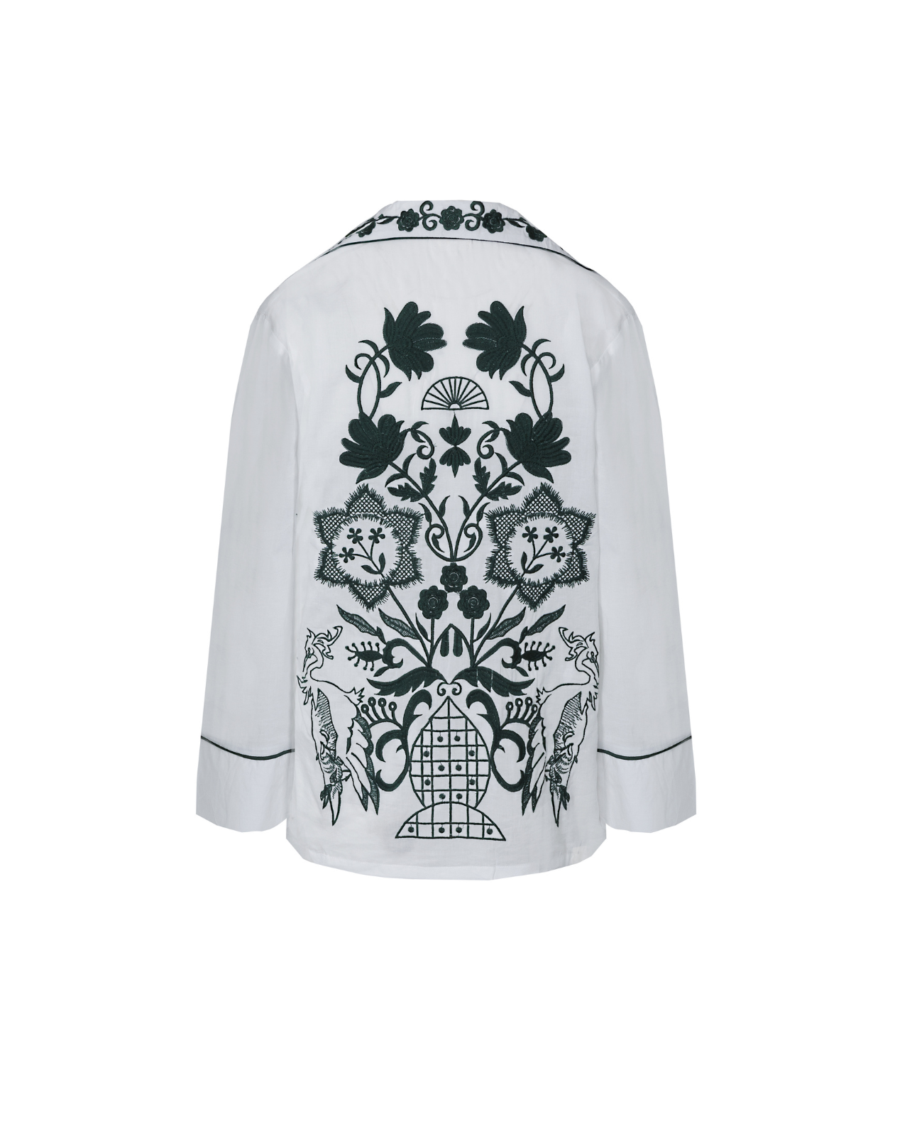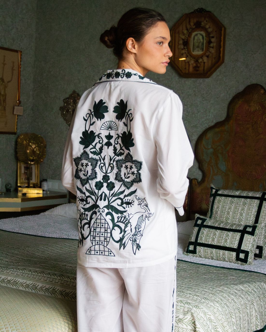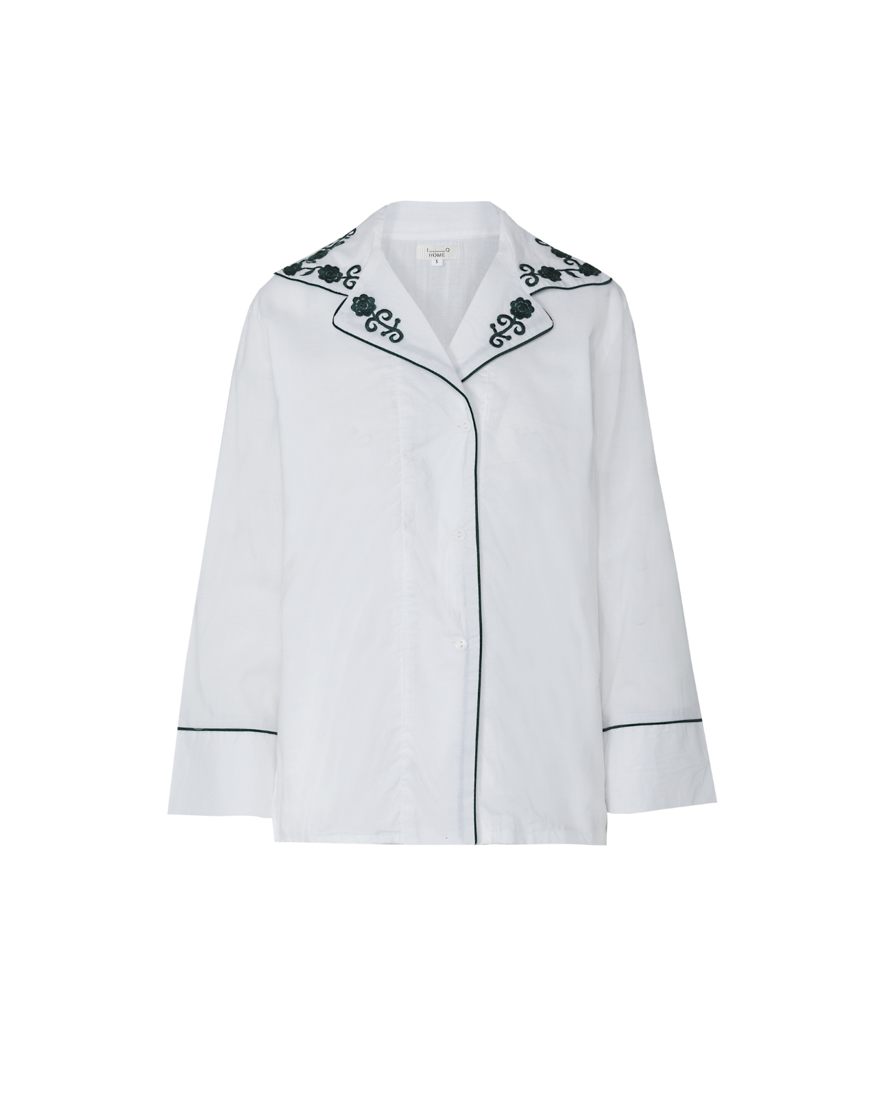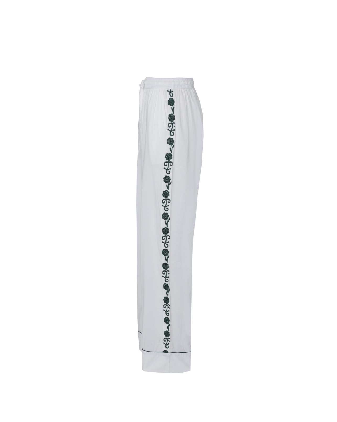 Pijama blanco con ribete en color verde y detalles de bordado en laterales, cuello y espalda. Camisa con cierre de botones y manga larga. Pantalón largo con cinturilla elástica.