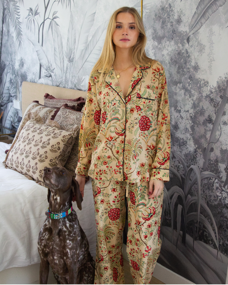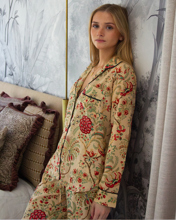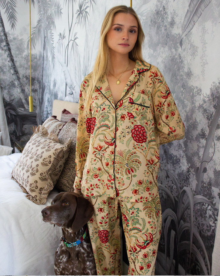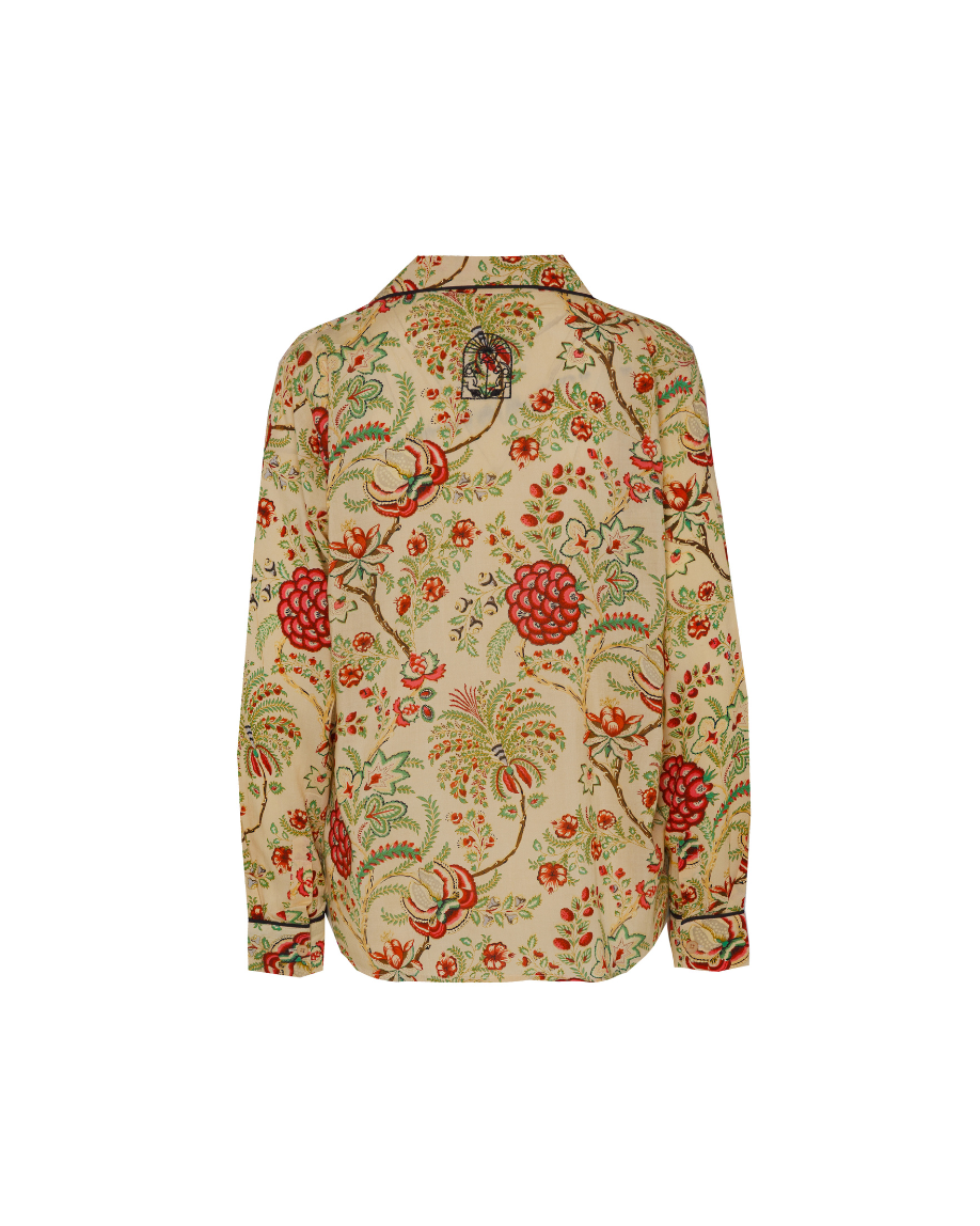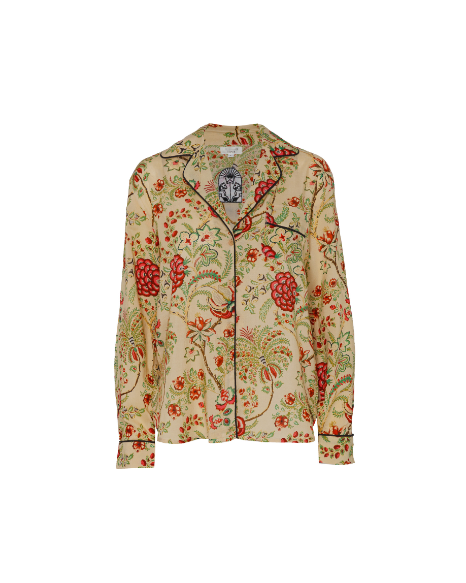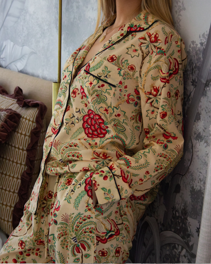 Conjunto de pijama de camisa y pantalón largo de modal. En estampado floral en tonos rosas con ribete en color negro y bolsillo. Logo bordado en la espalda.