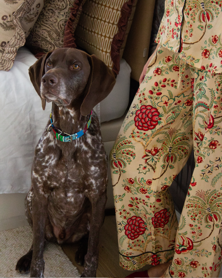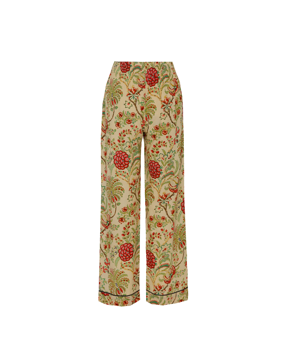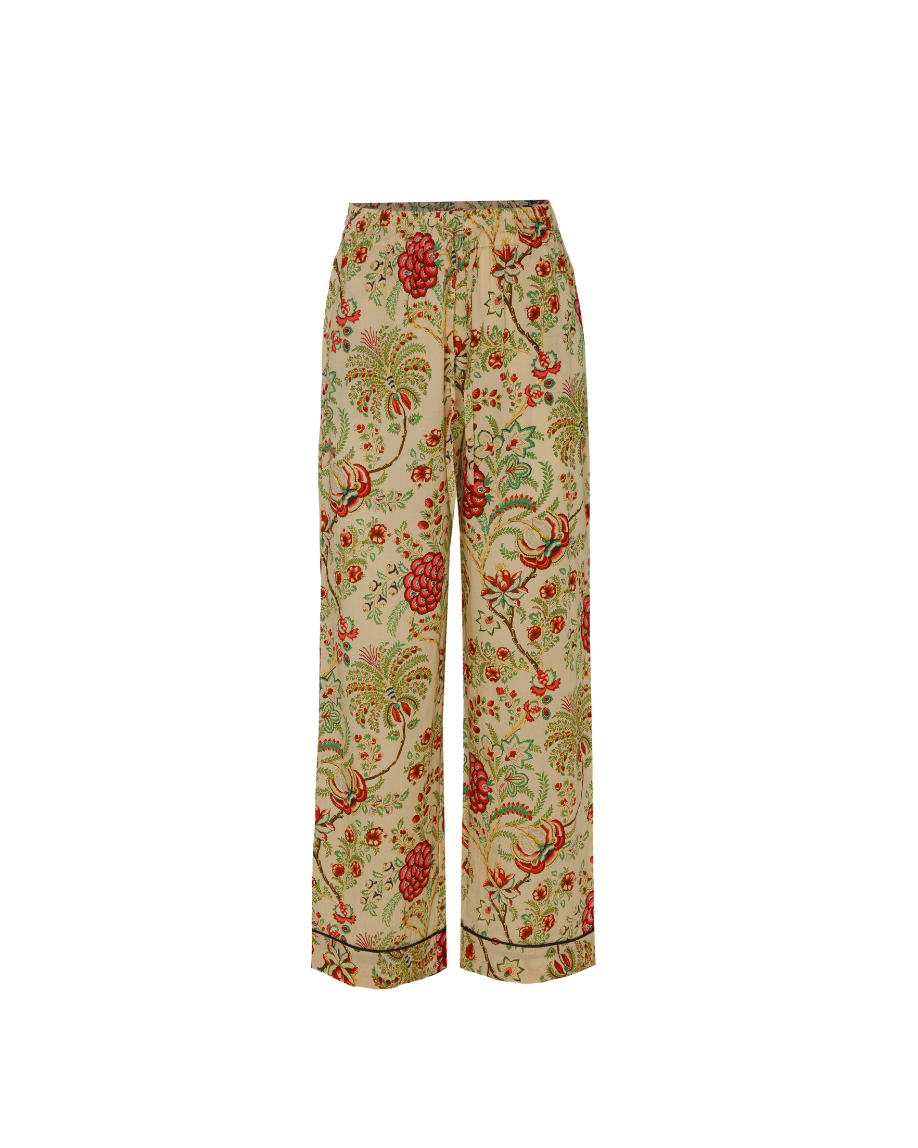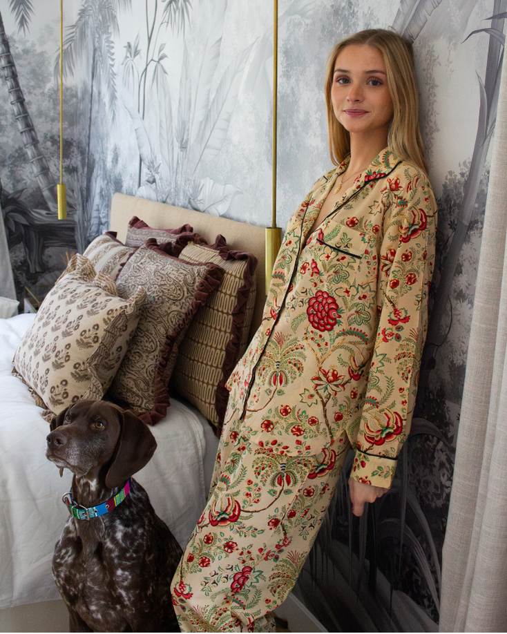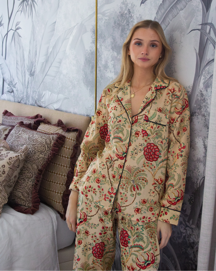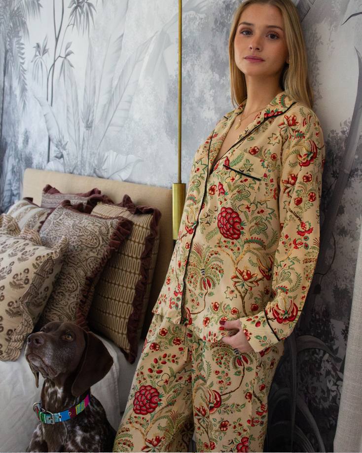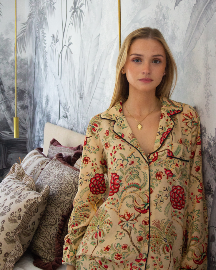 Conjunto de pijama de camisa y pantalón largo de modal. En estampado floral en tonos rosas con ribete en color negro y bolsillo. Logo bordado en la espalda.