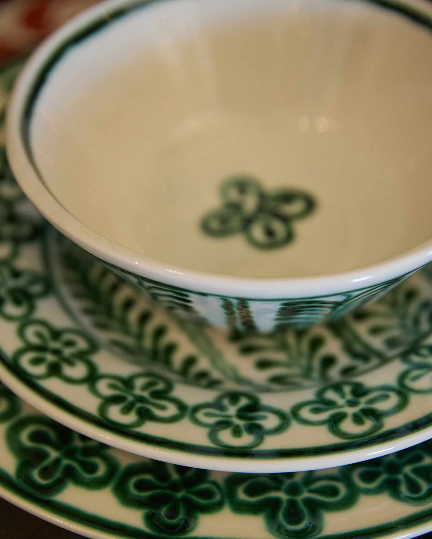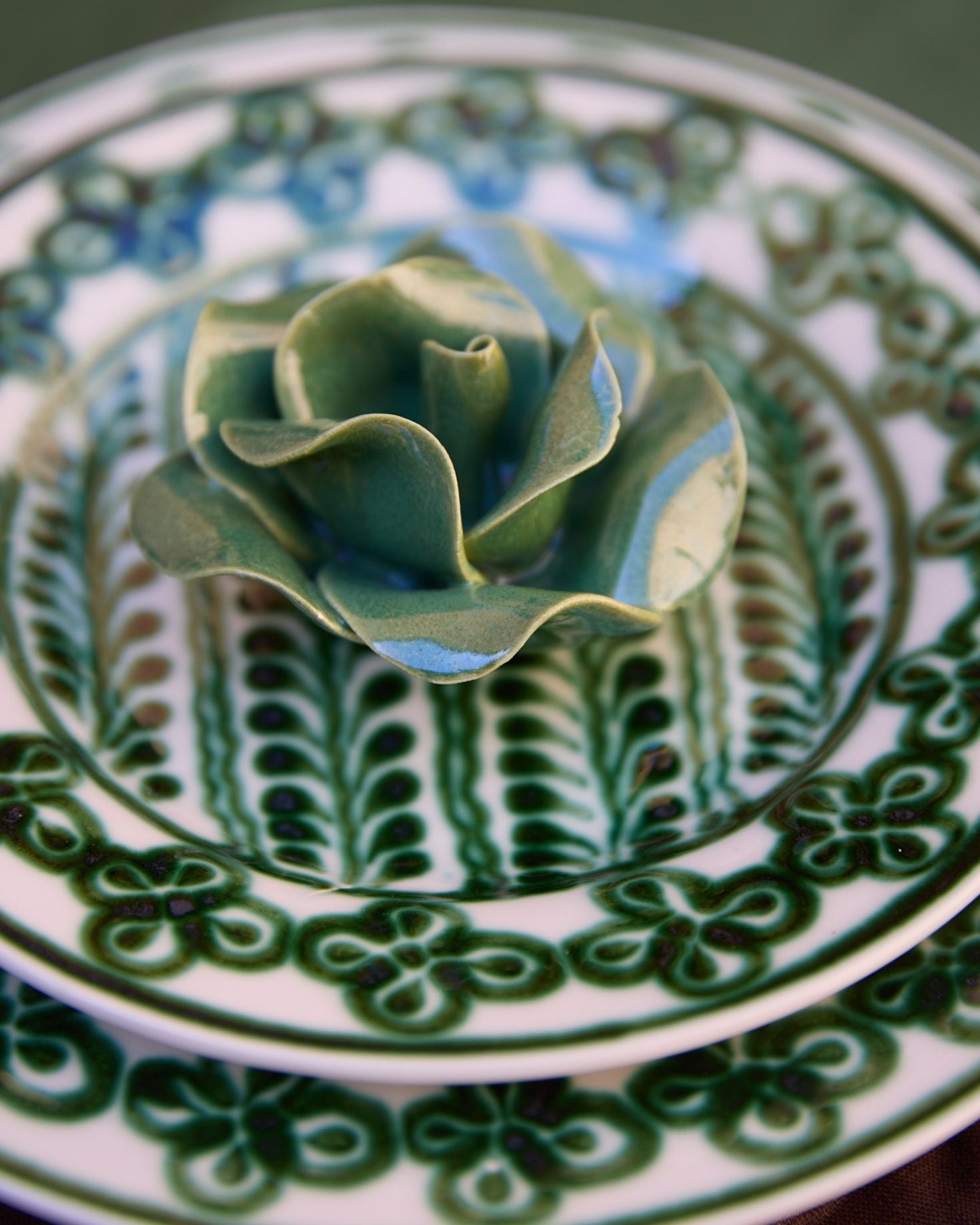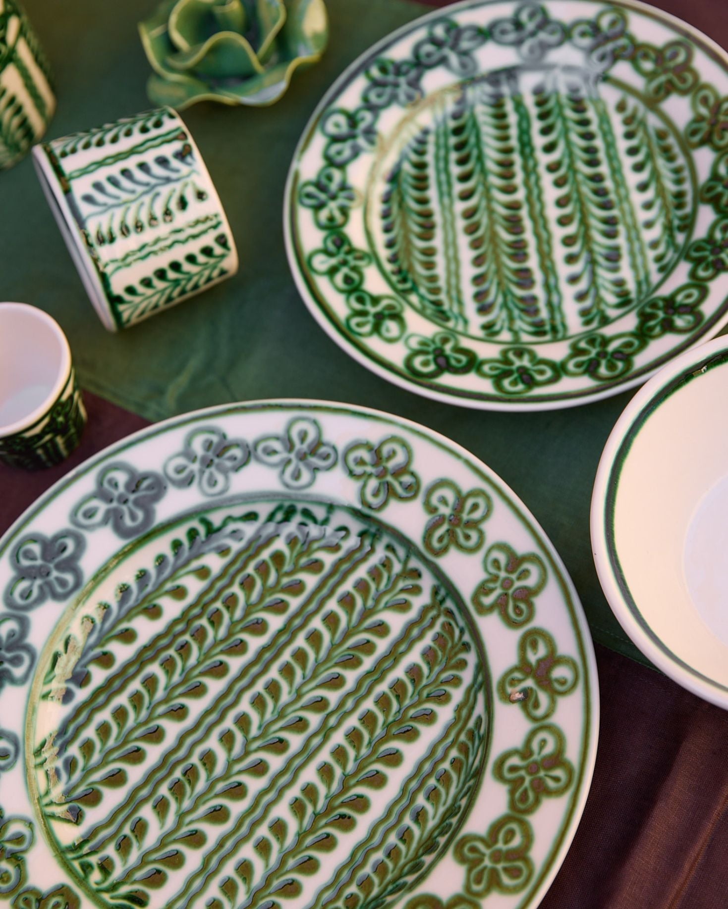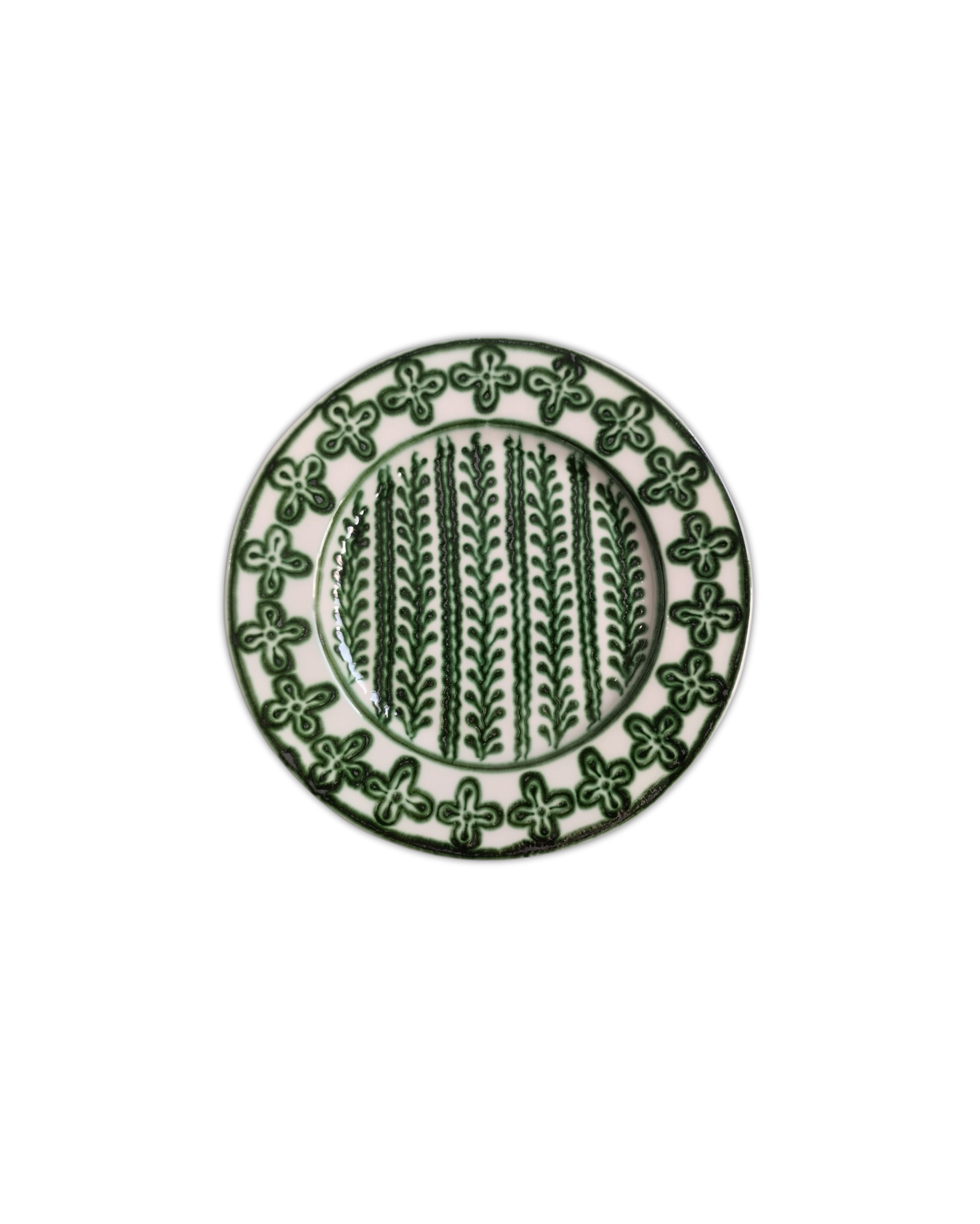 Plato de postre hecho en cerámica pintado a mano en color verde y detalles naturales.