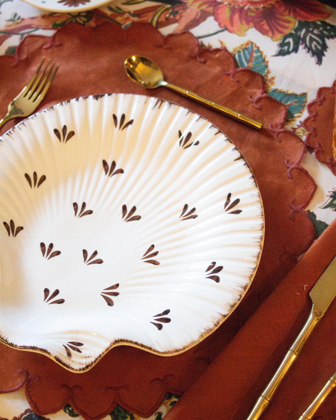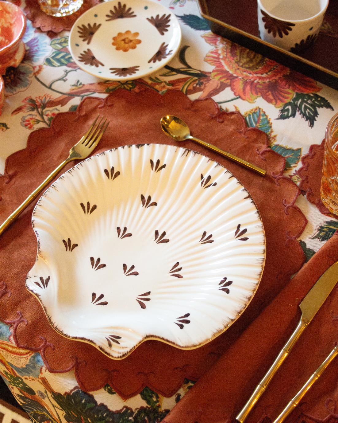 Plato de llano con forma de concha hecho en cerámica con detalles pintados a mano en color marrón.