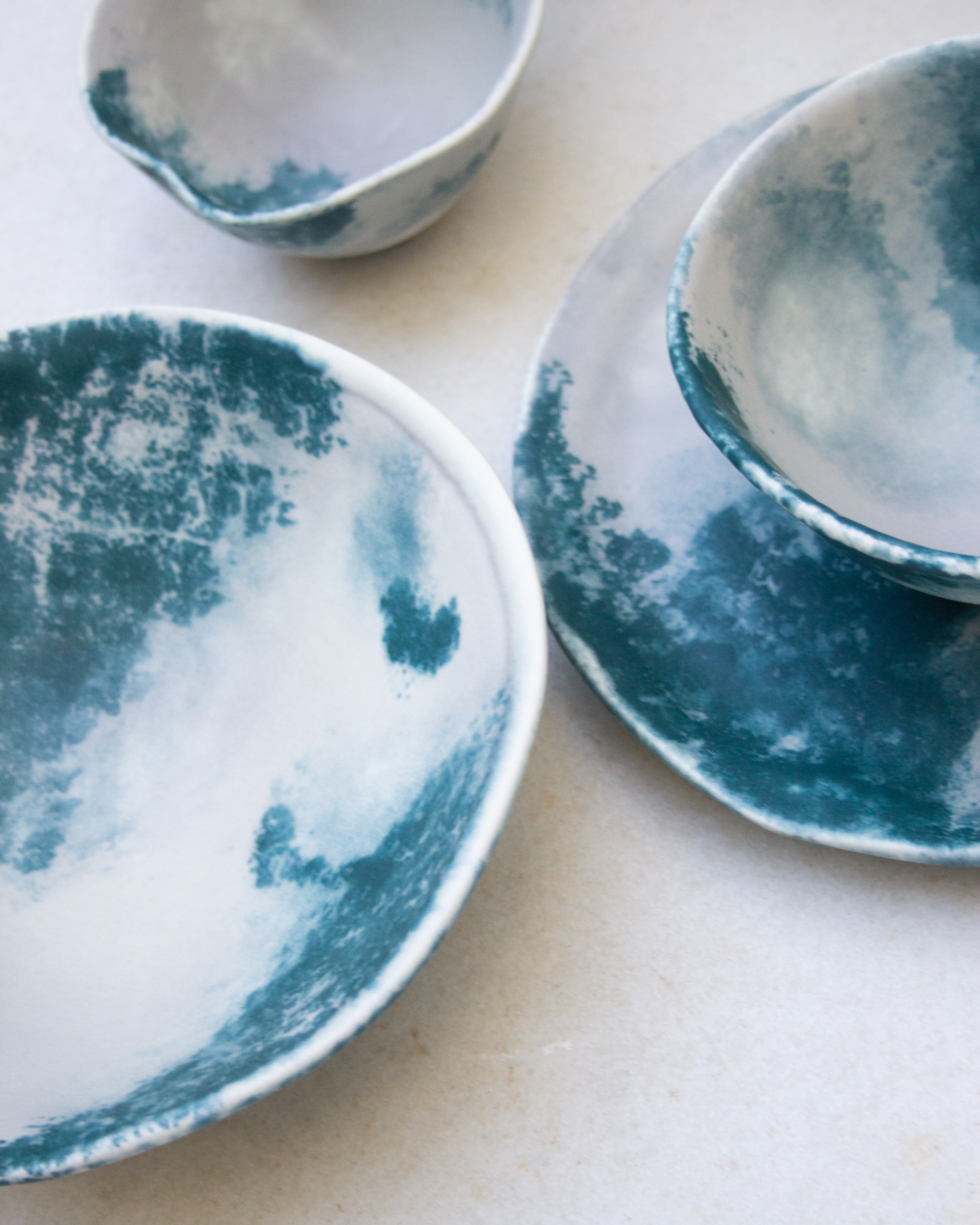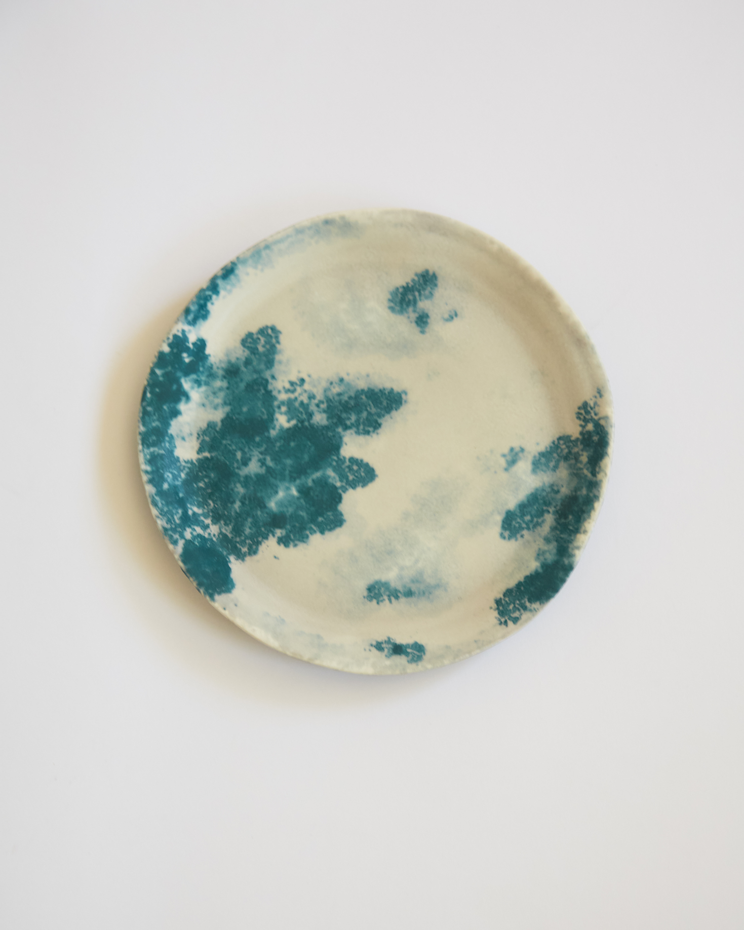 Plato de postre orgánico de cerámica artesanal pintada a mano en tonos blancos y verdes.