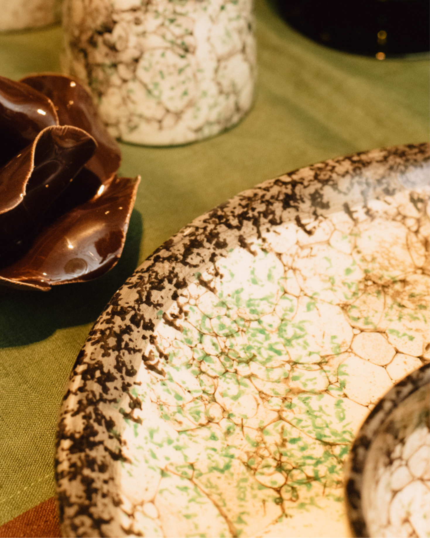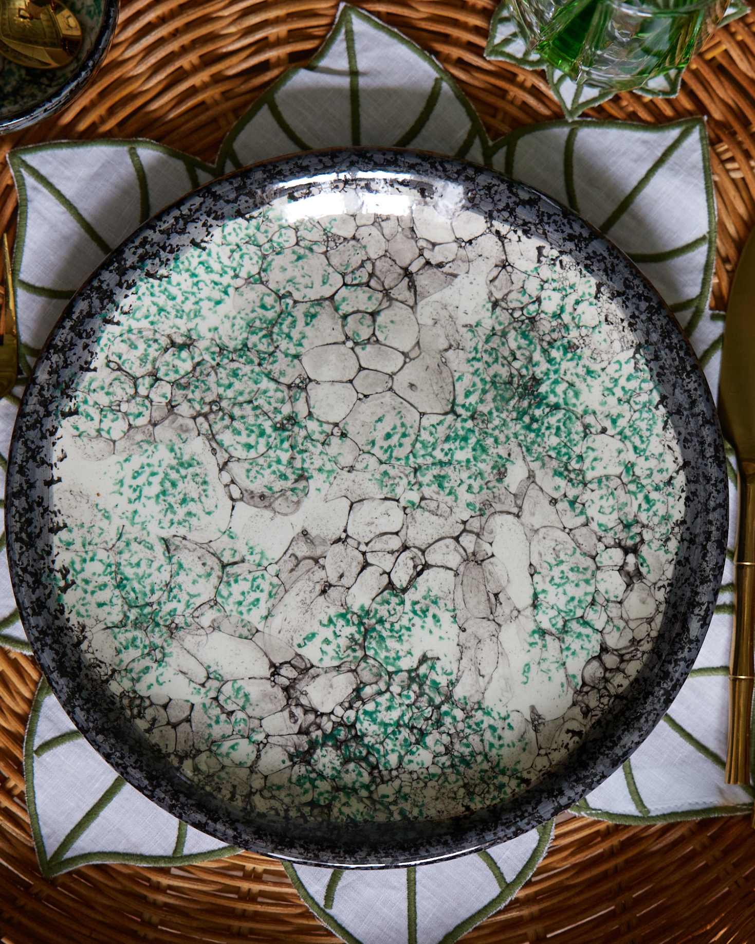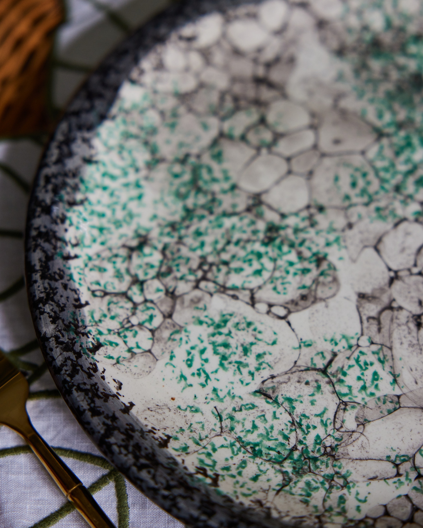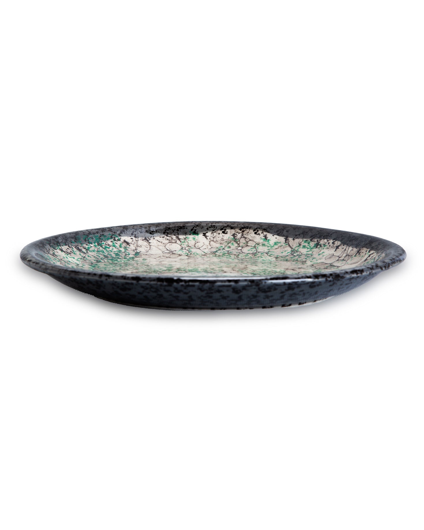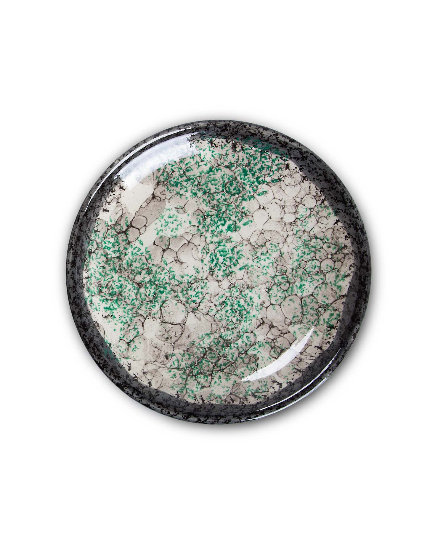 Plato redondo aqua de cerámica en tonos verdes y marrones.