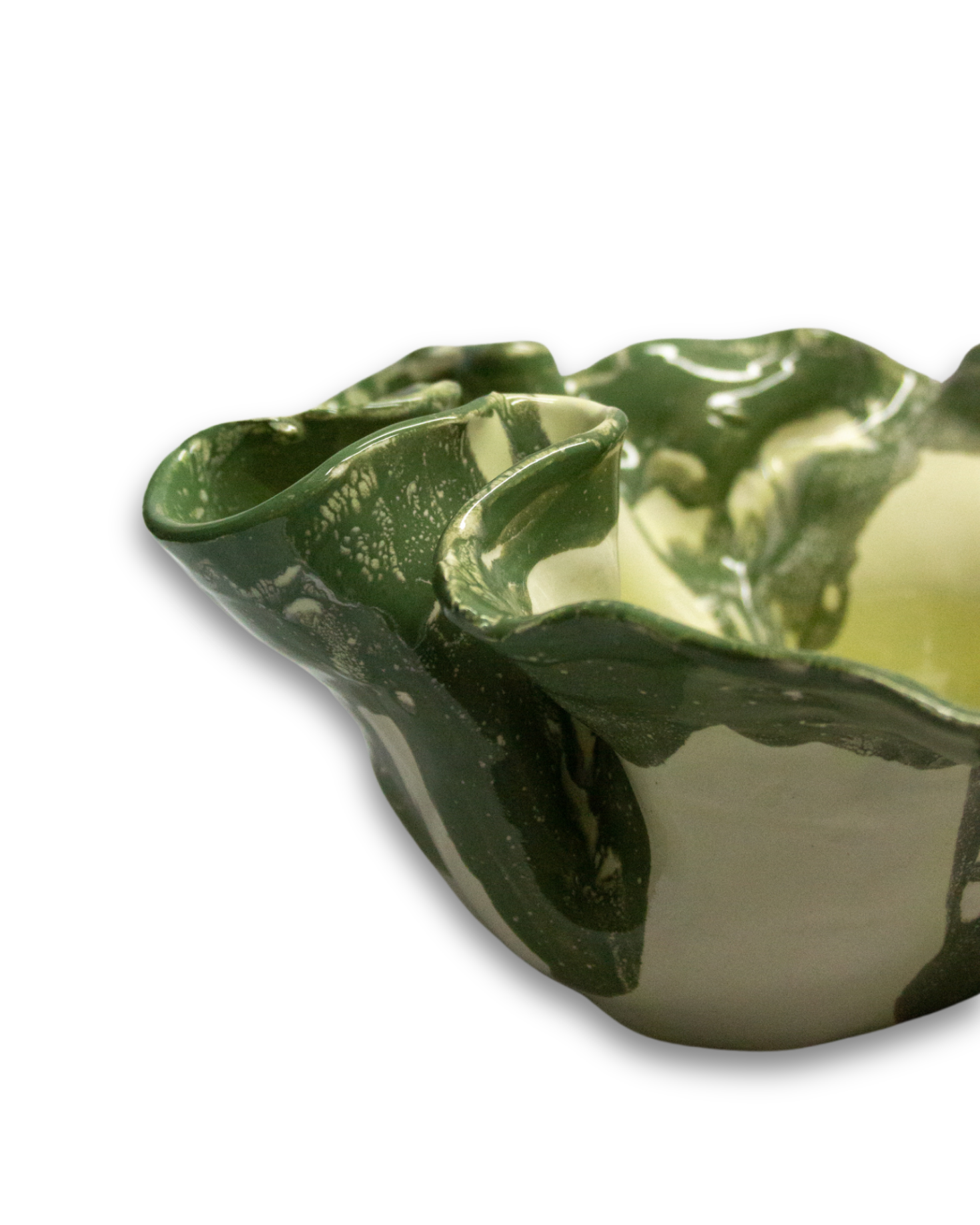 Cuenco mediano con bordes irregulares hecho a mano en cerámica artesanal en tonos verdes y amarillos. Al ser un producto artesano cada pieza es única y diferente.