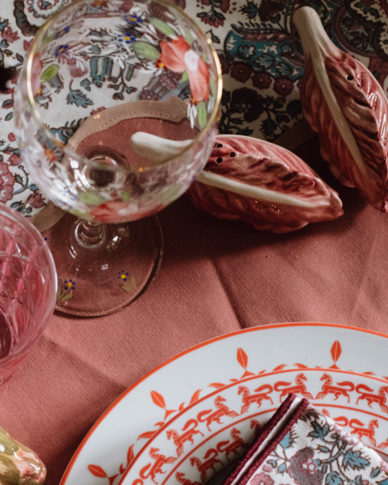 Salero y pimentero en forma de flor hechos en cerámica y pintados a mano en color rosa.