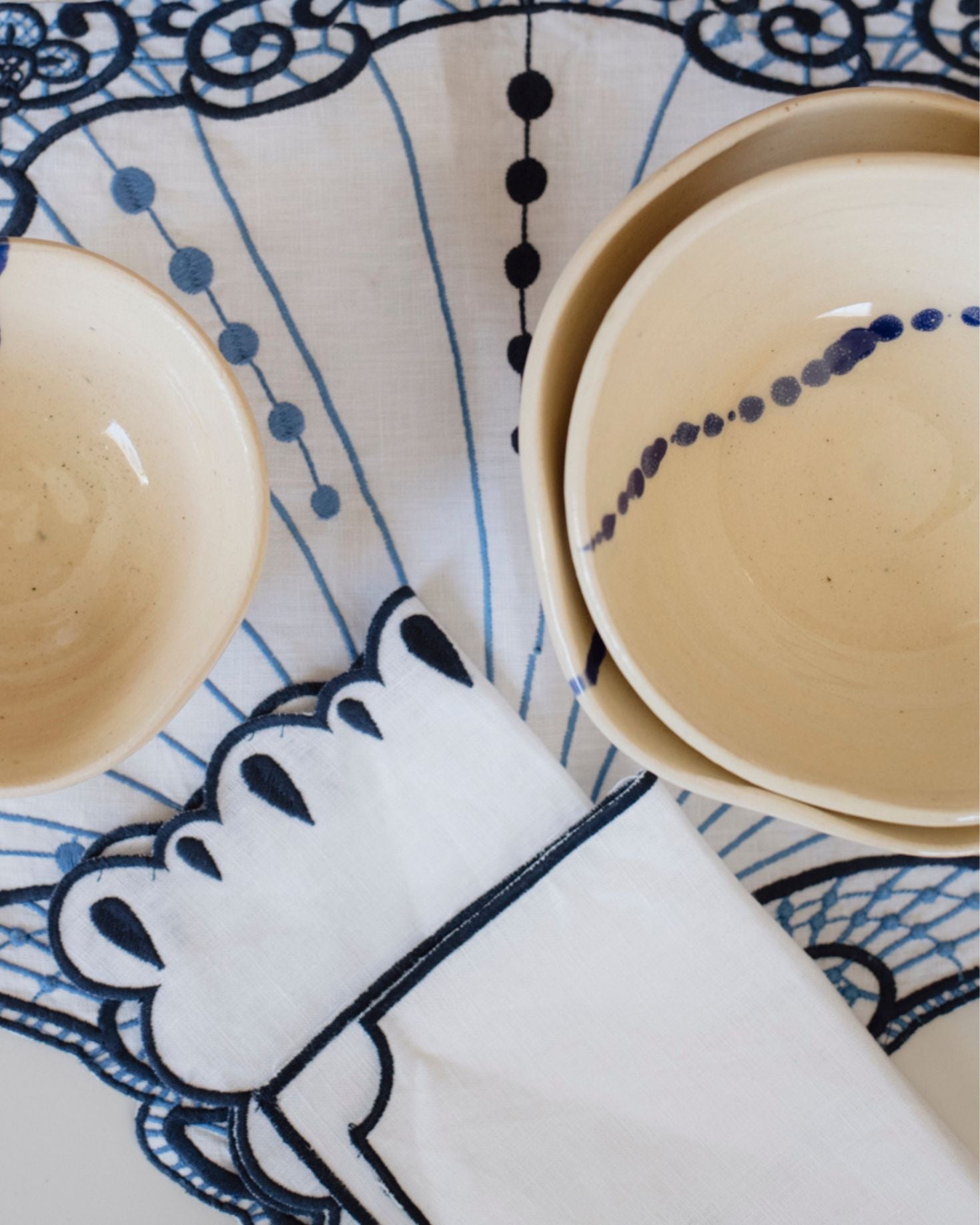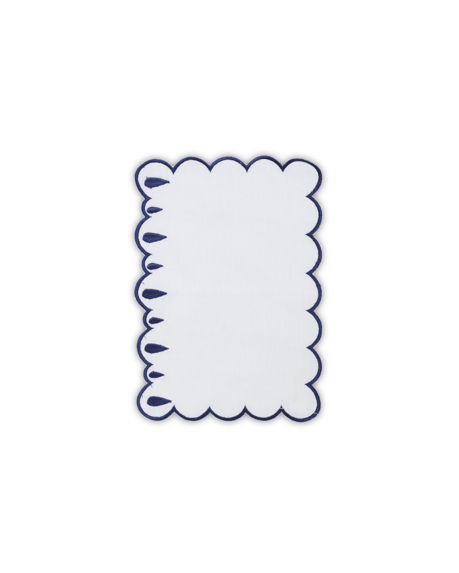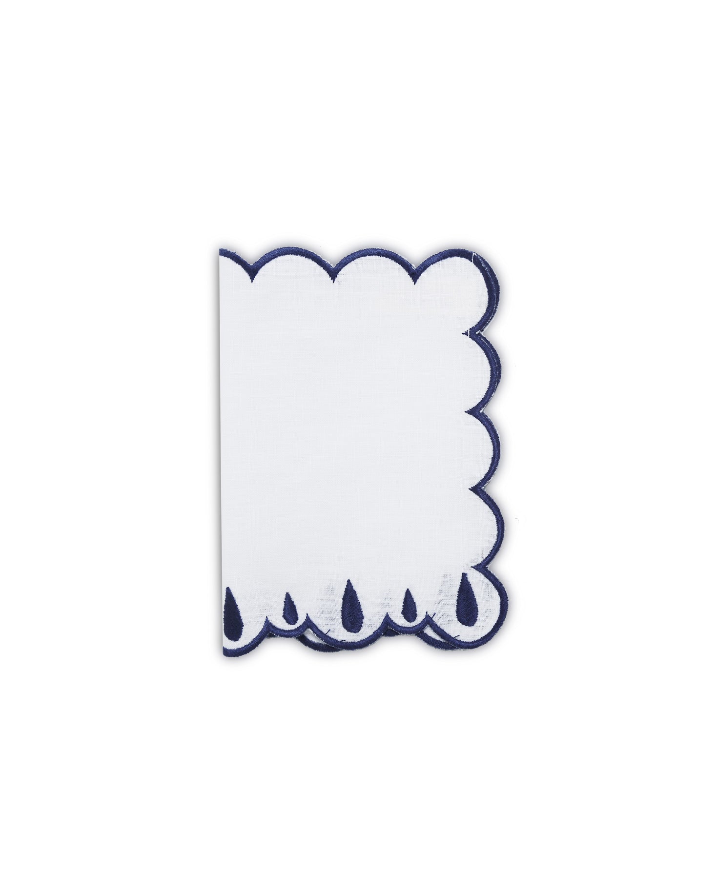 Pack de 4 servilletas de cocktail en lino 100% en color blanco. Con bordados en forma de gota en colores marrón y azul.