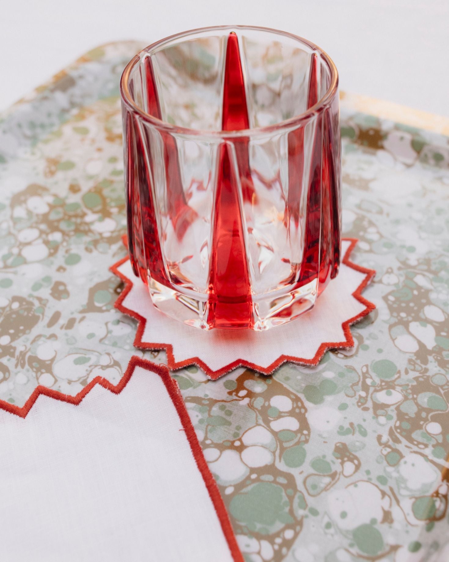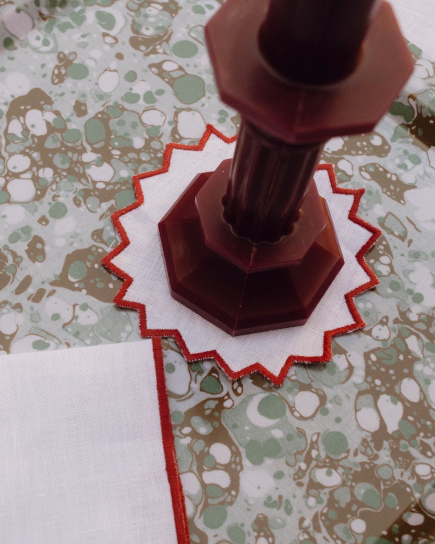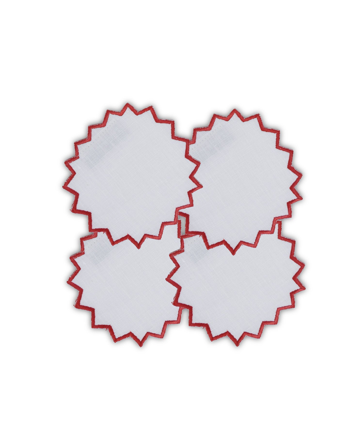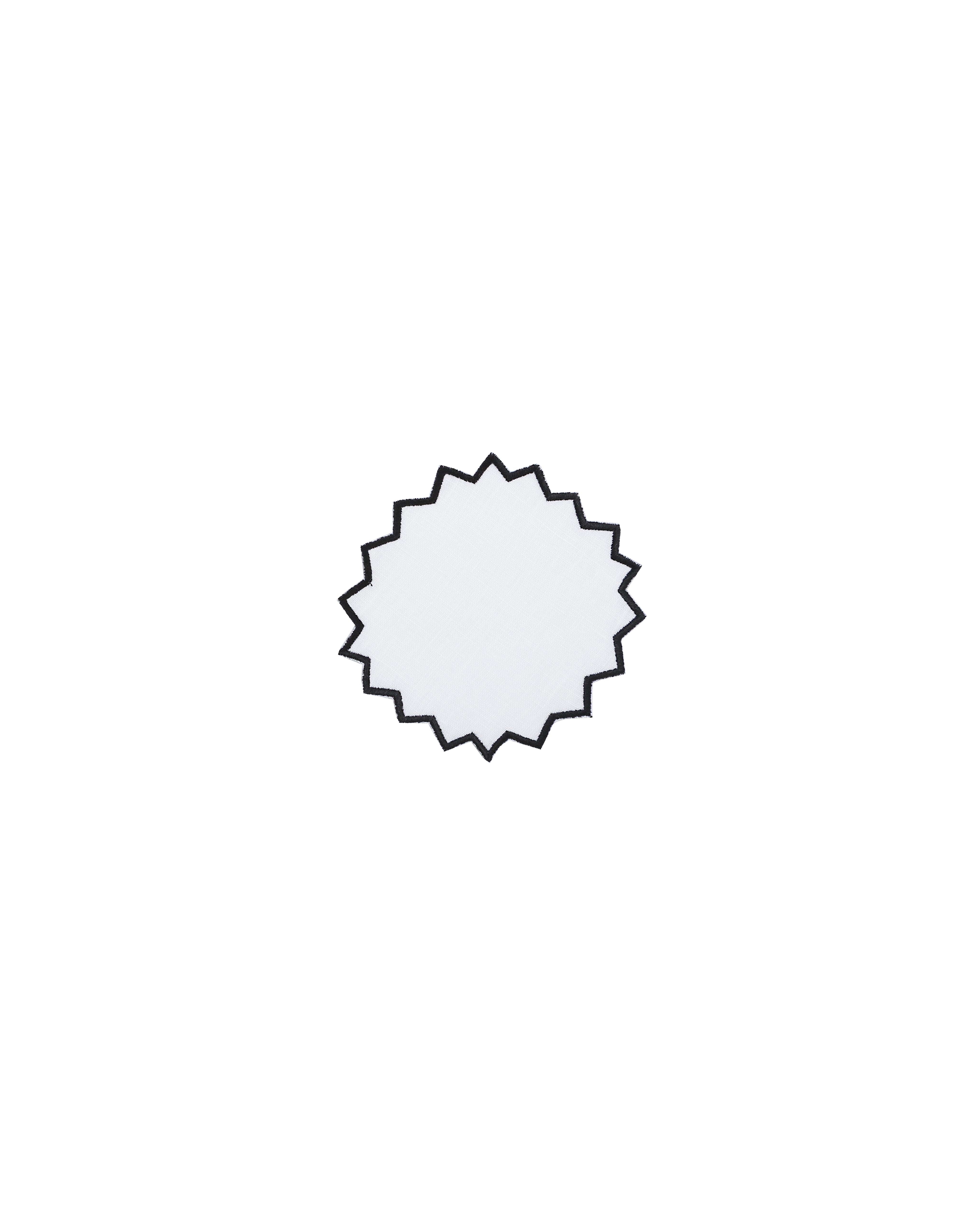 Pack de 4 paneras ó posavasos en lino 100%. Con bordes en forma geométrica y bordados en color negro o burdeos.