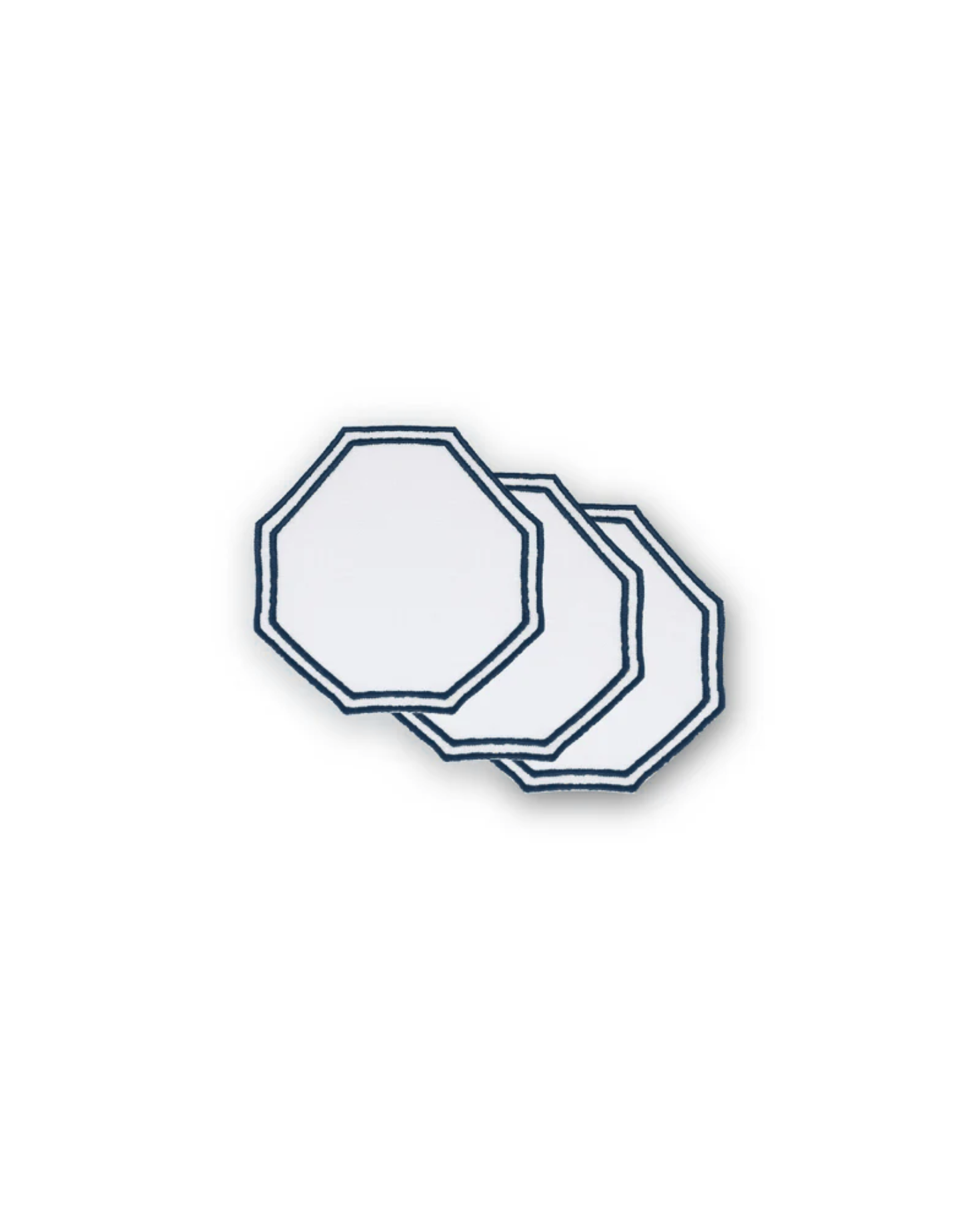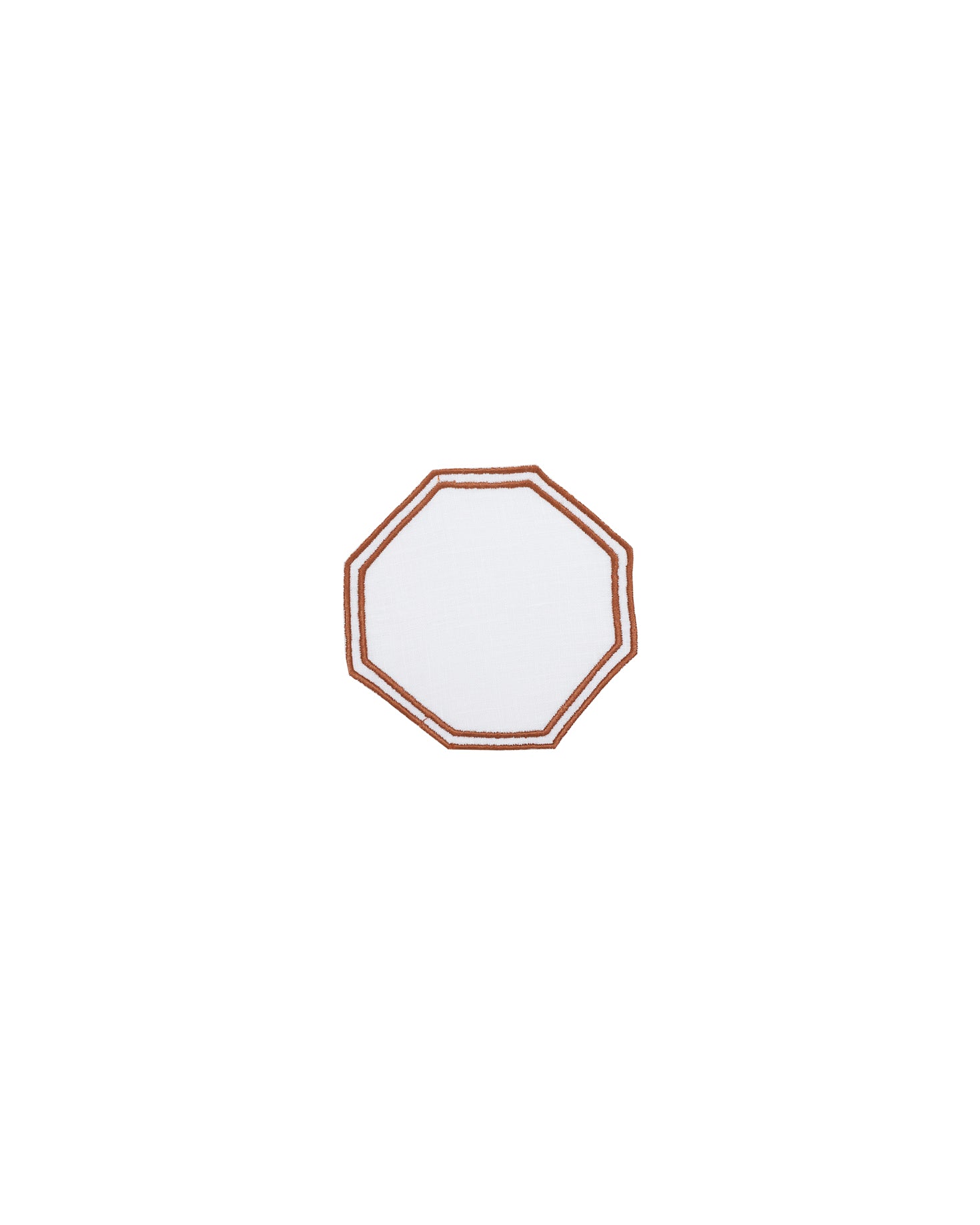 Pack de 4 paneras ó posavasos en lino 100%. Con bordes en forma geométrica y bordado disponible en color marrón o azul.