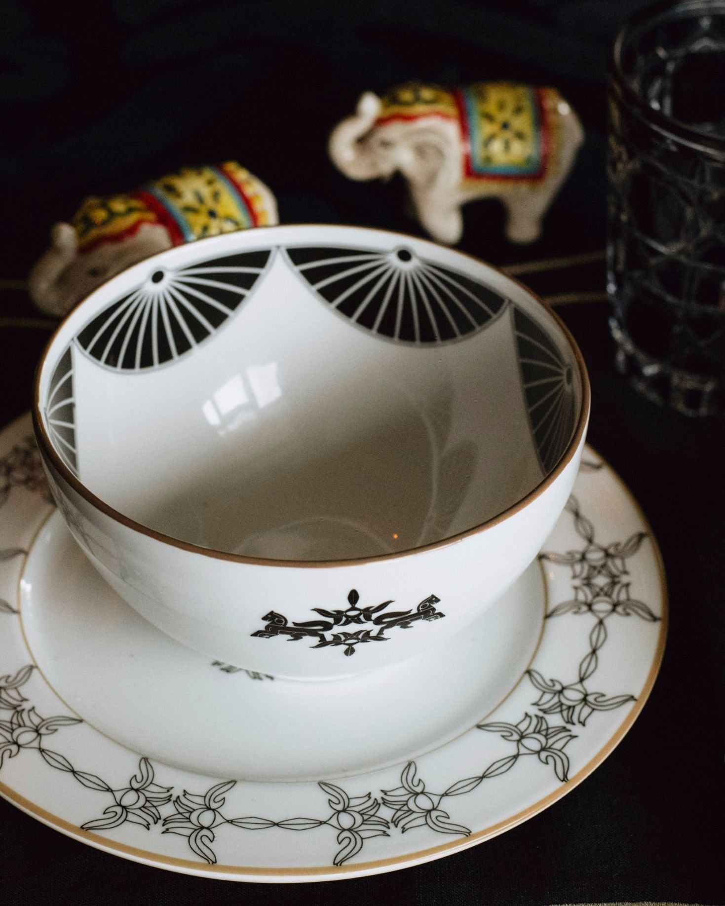 Set de aperitivo ecuestre compuesto por 2 cuencos en color blanco y negro con elementos del logo.