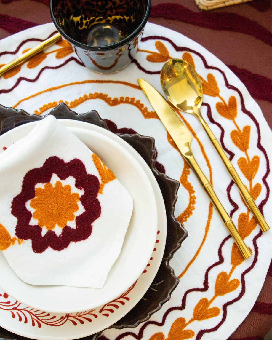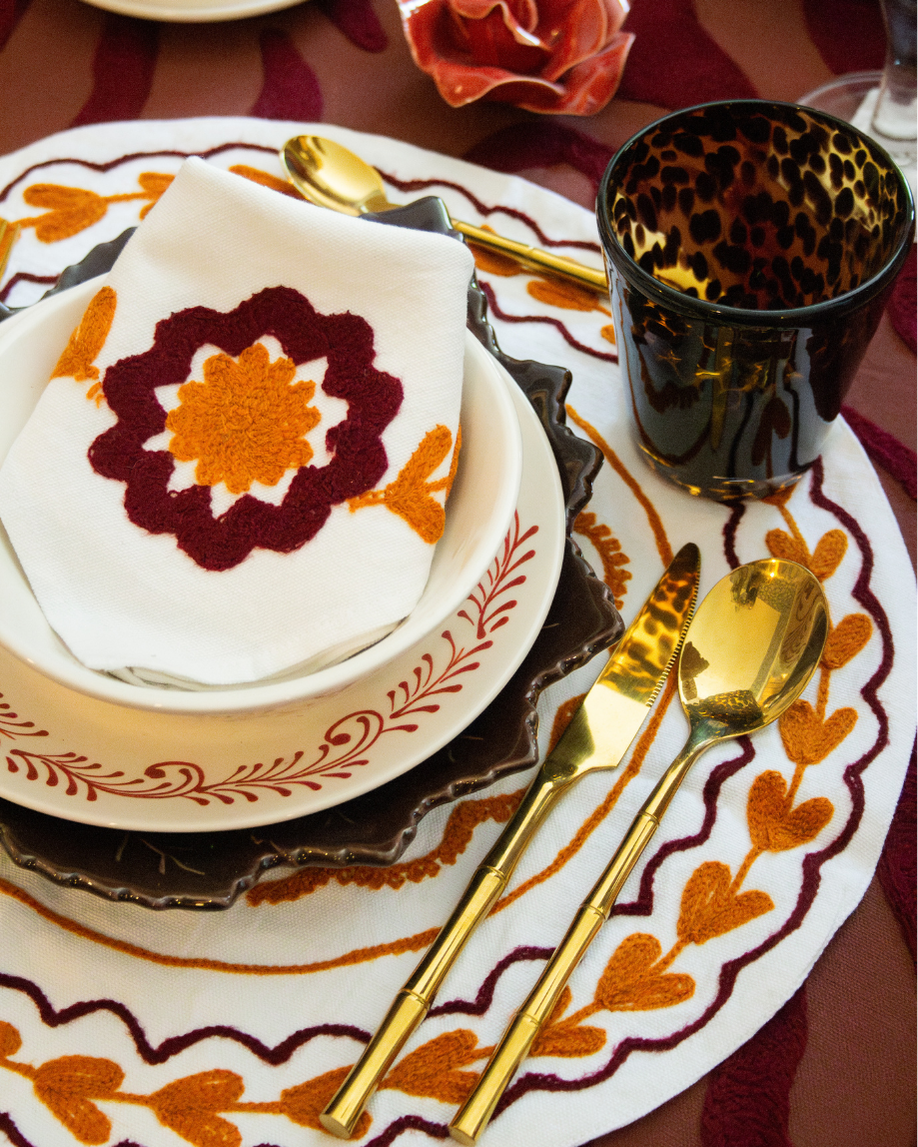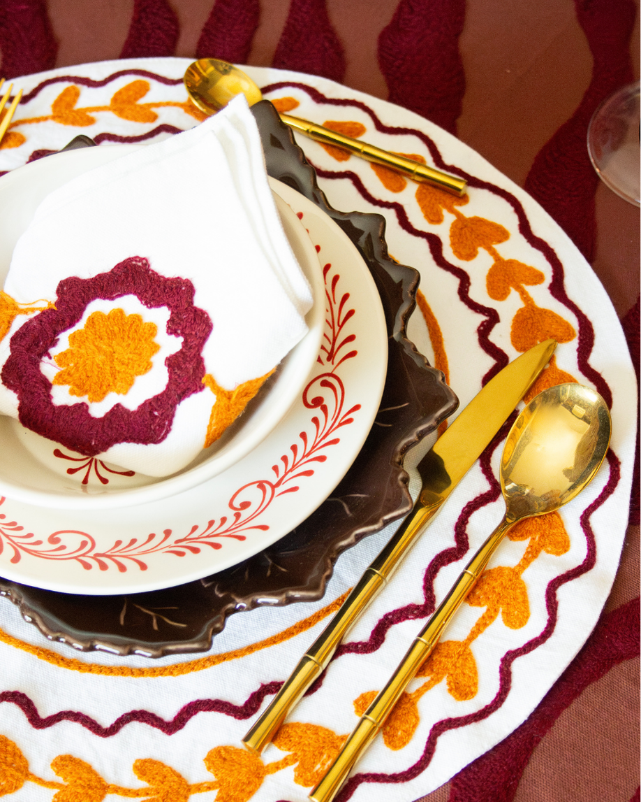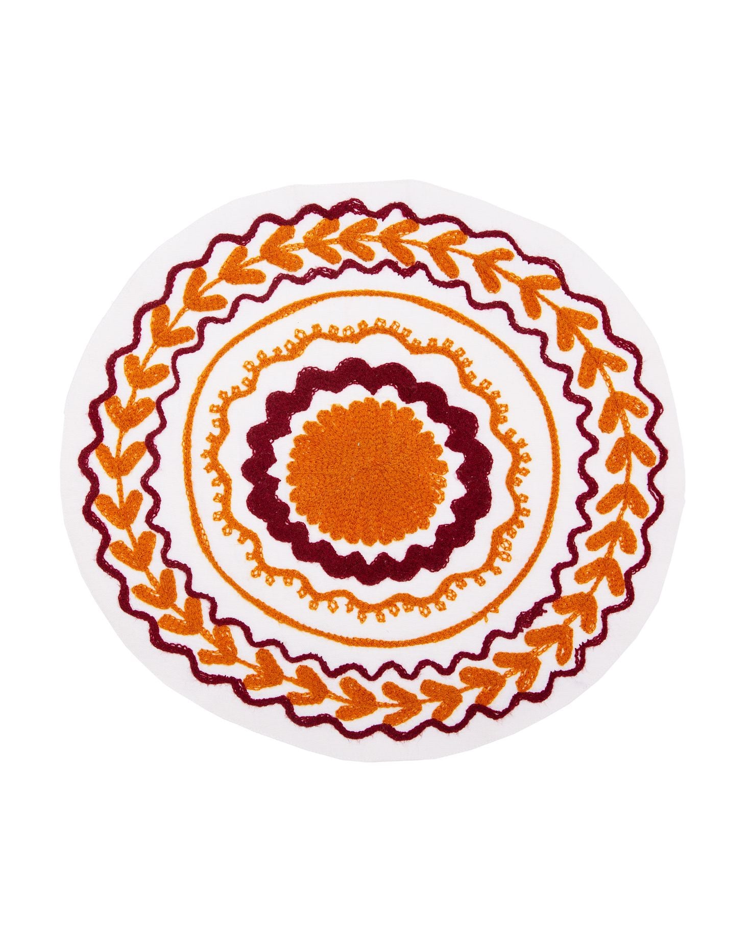 Set individual redondo y servilleta blanco con diseño bordado a mano en hilo tonos naranjas y burdeos. También disponible en tonos verdes y azules.