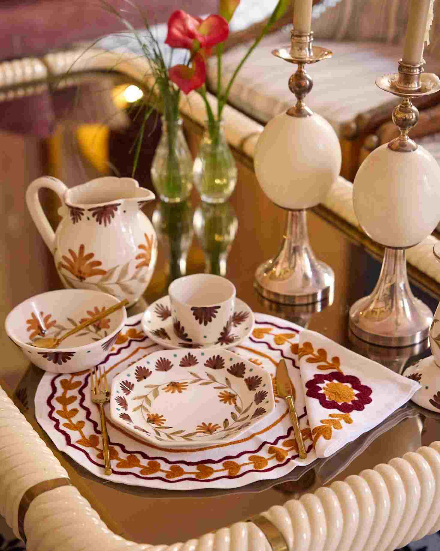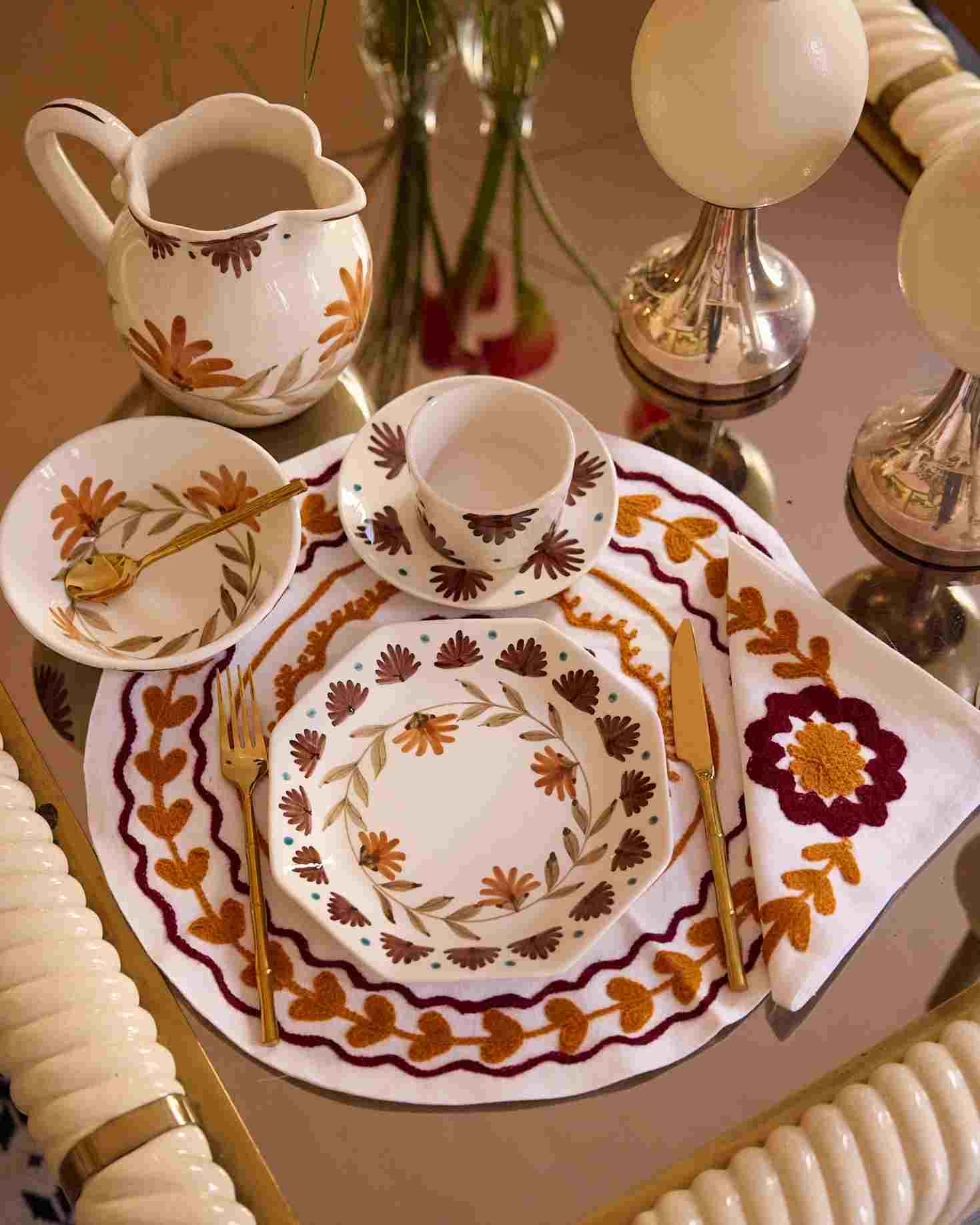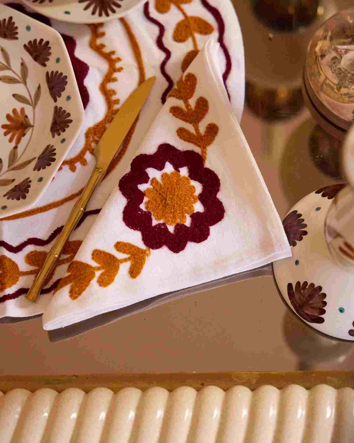 Set individual redondo y servilleta blanco con diseño bordado a mano en hilo tonos naranjas y burdeos. También disponible en tonos verdes y azules.