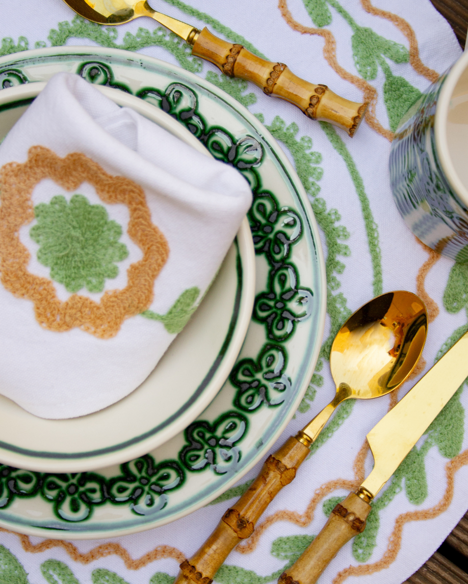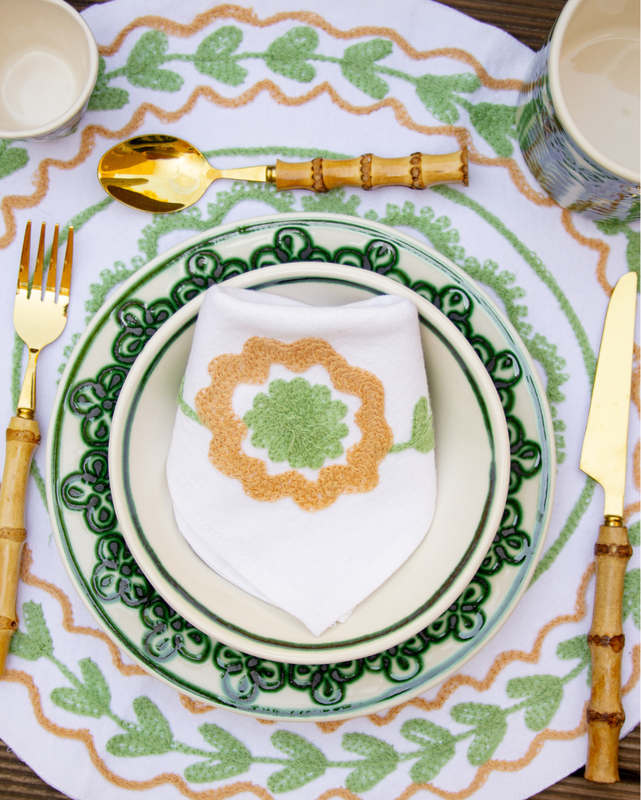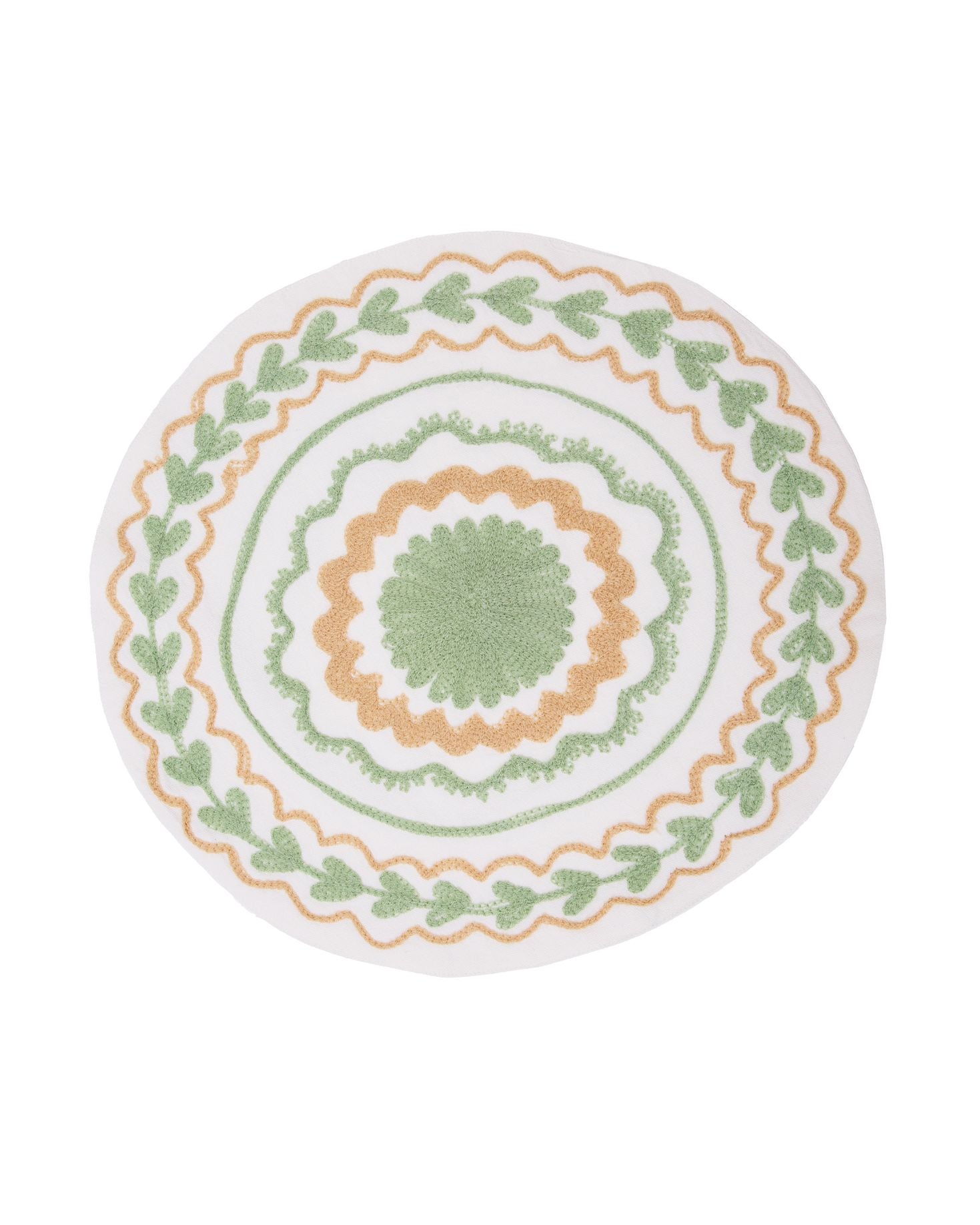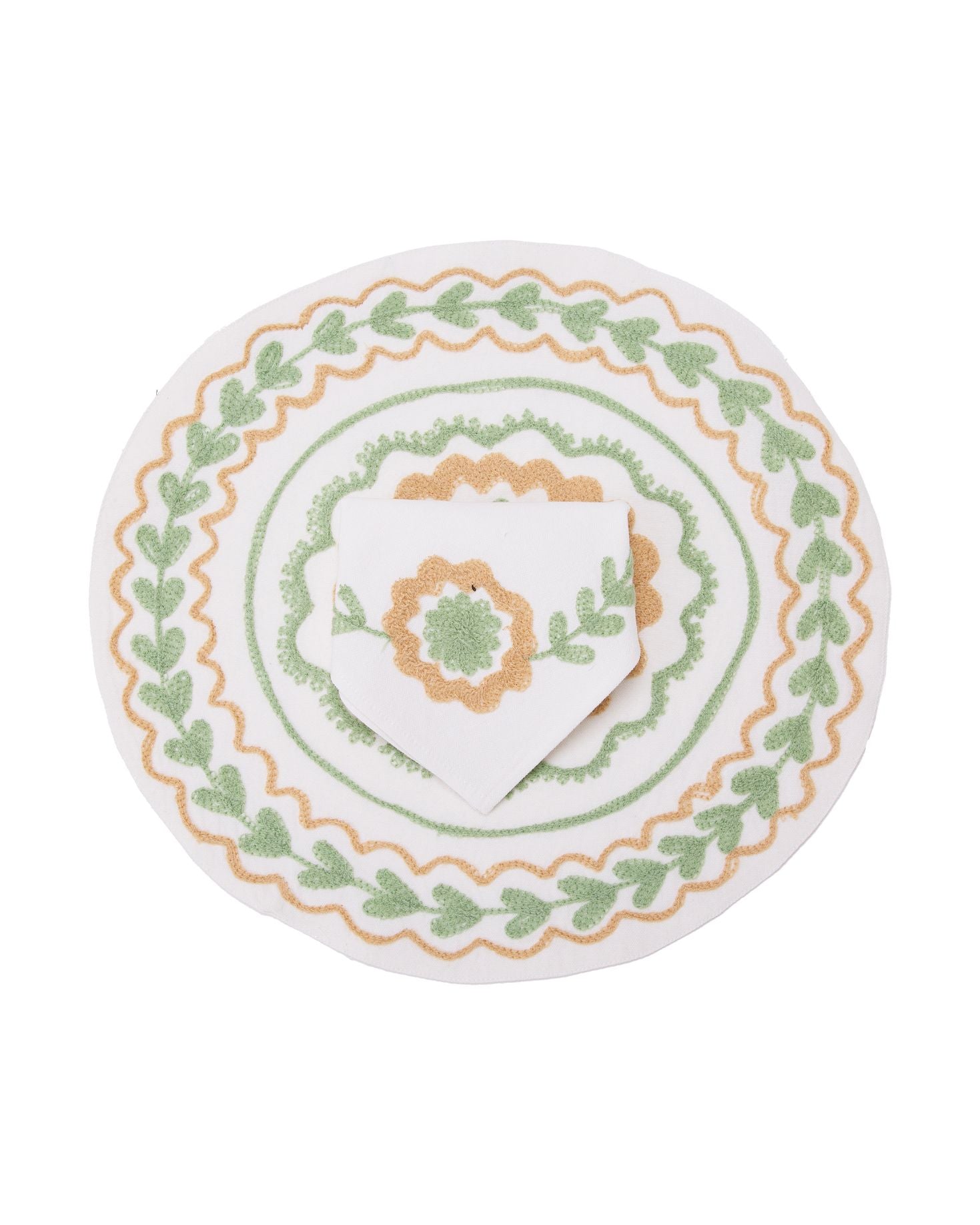 Set individual redondo y servilleta blanco con diseño bordado a mano en hilo tonos verdes y beige. También disponible en tonos naranjas y azules.