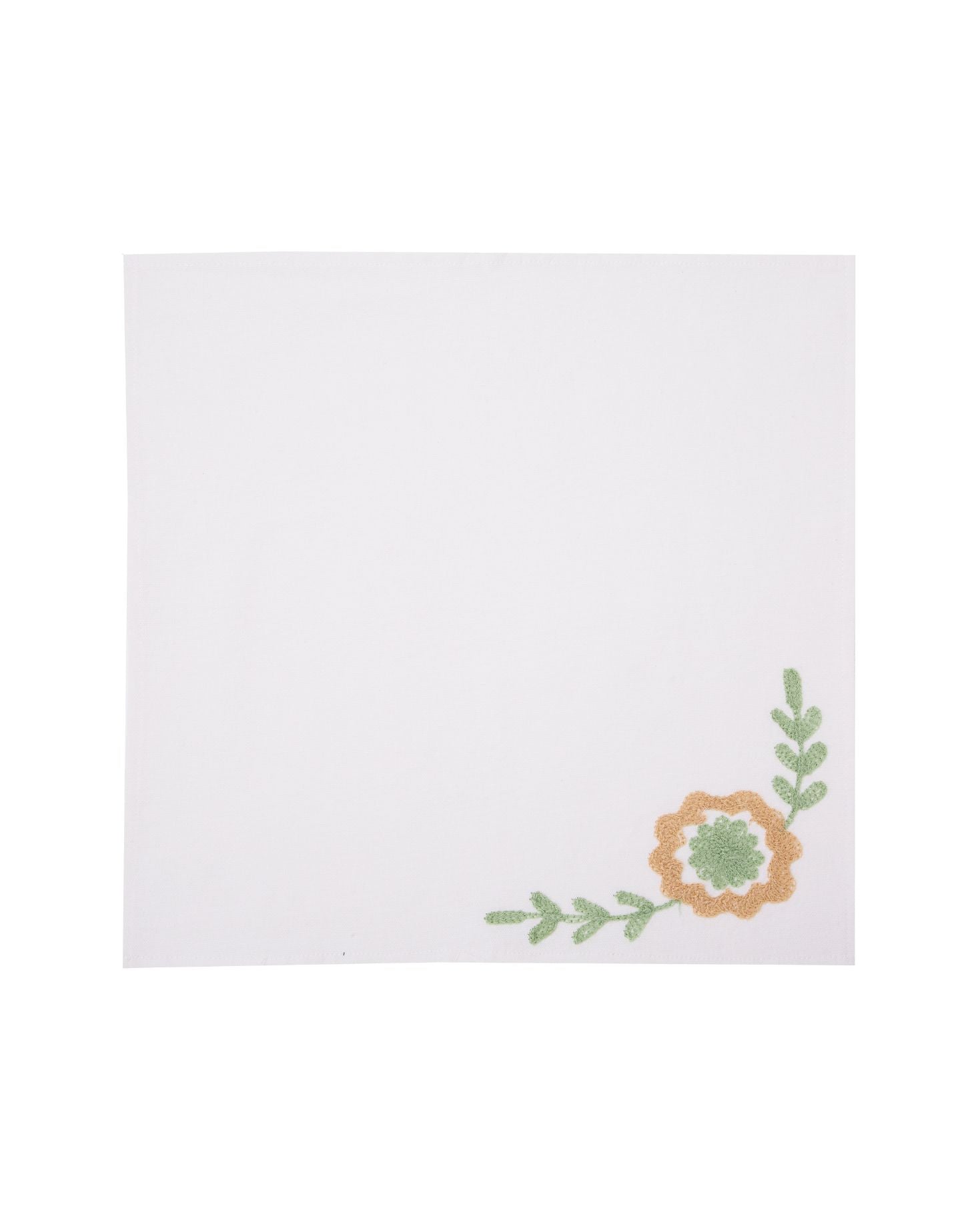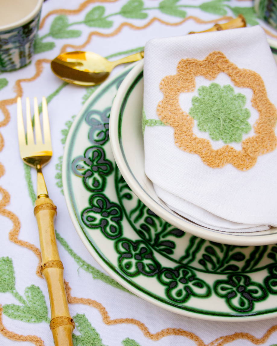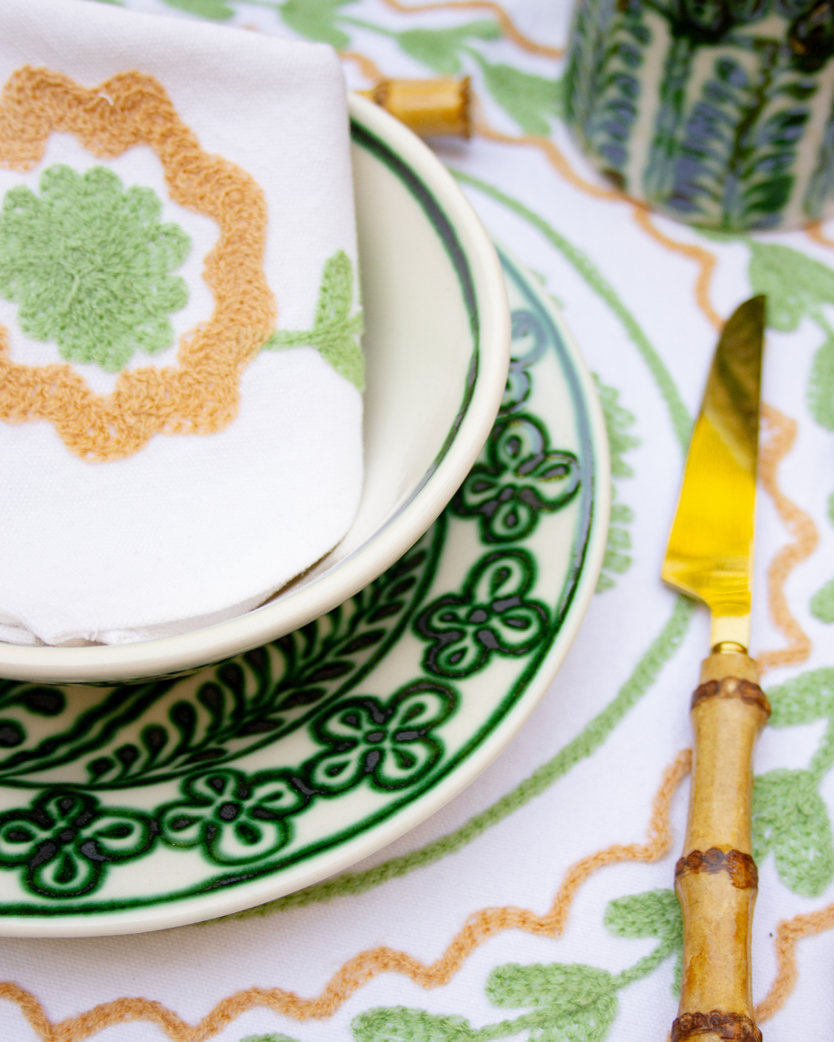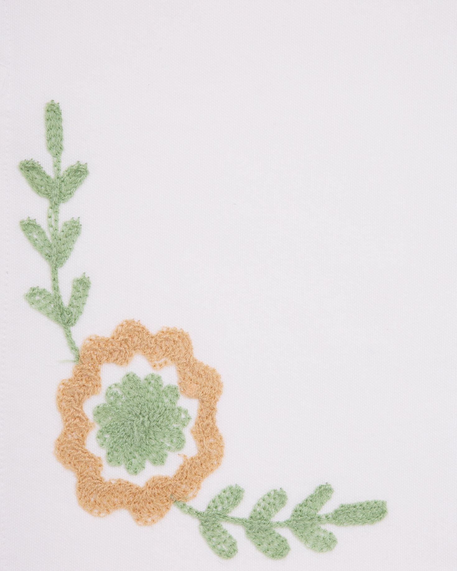Set individual redondo y servilleta blanco con diseño bordado a mano en hilo tonos verdes y beige. También disponible en tonos naranjas y azules.
