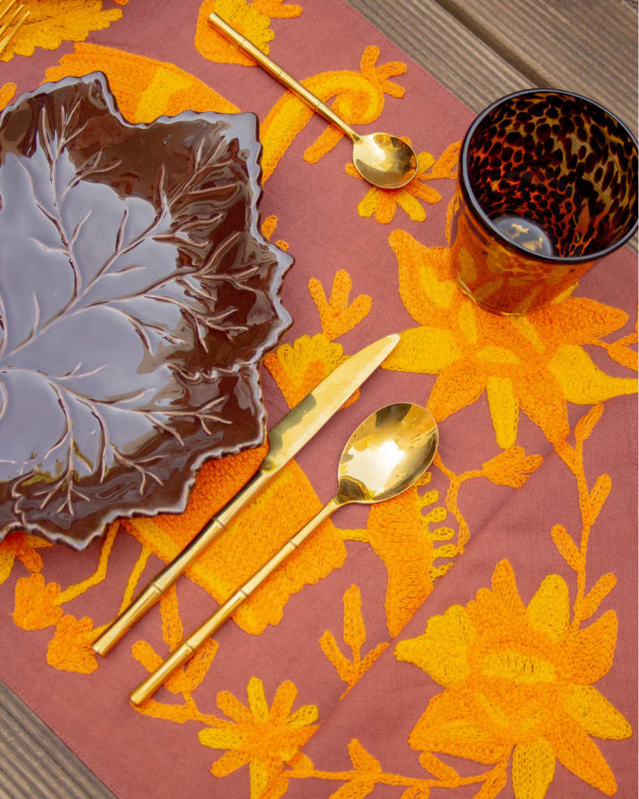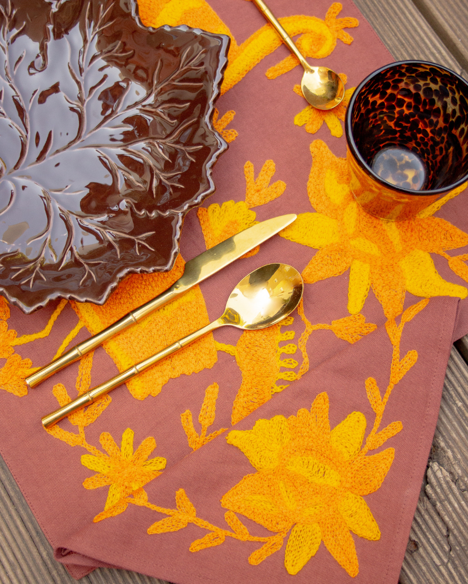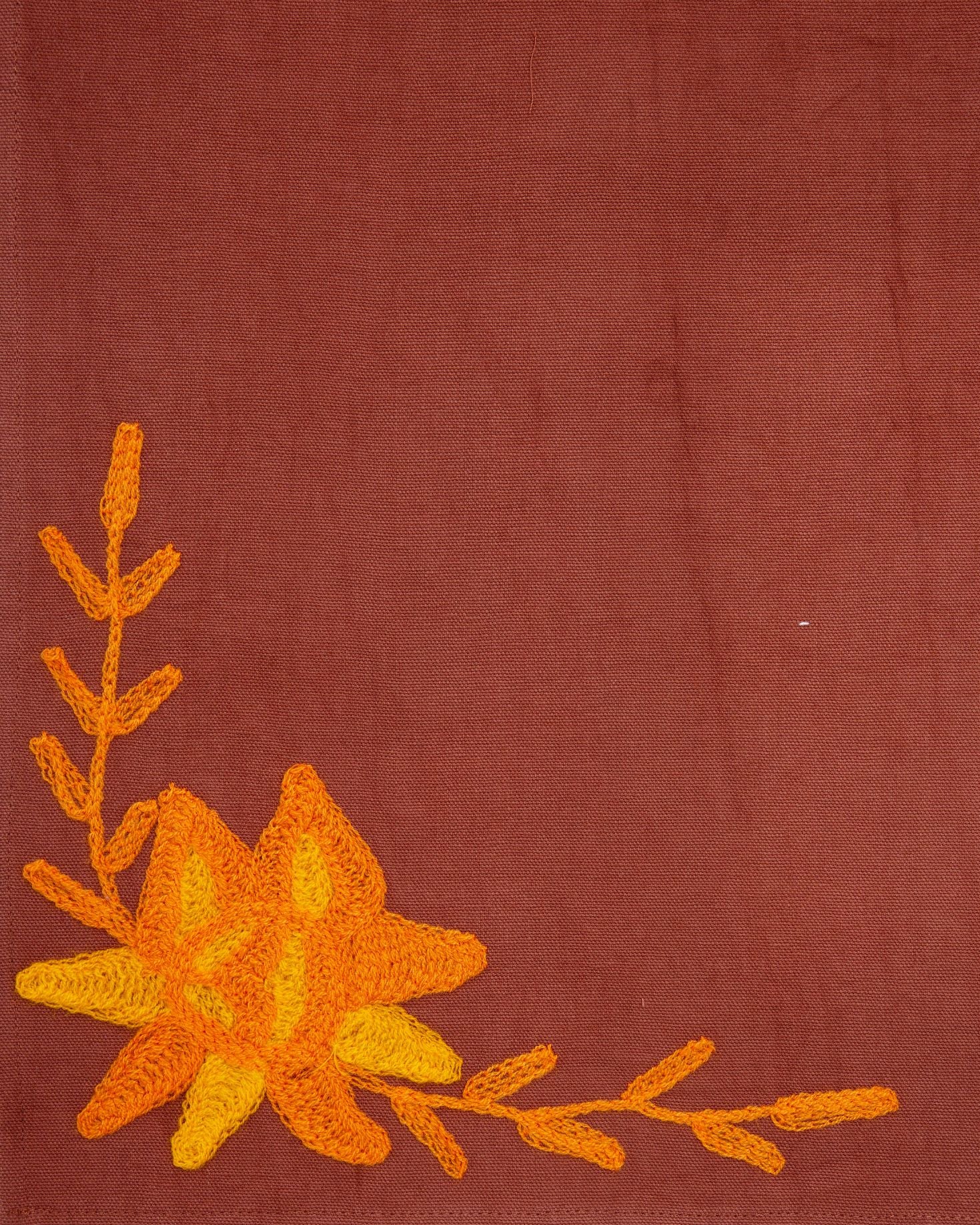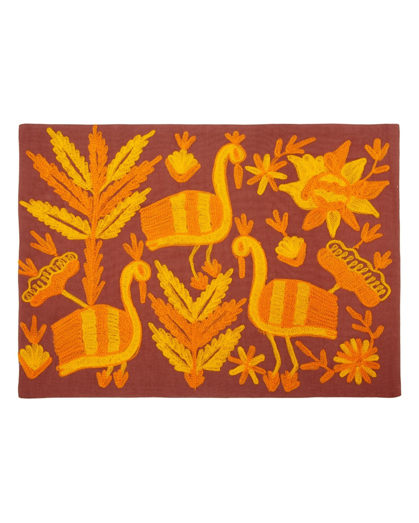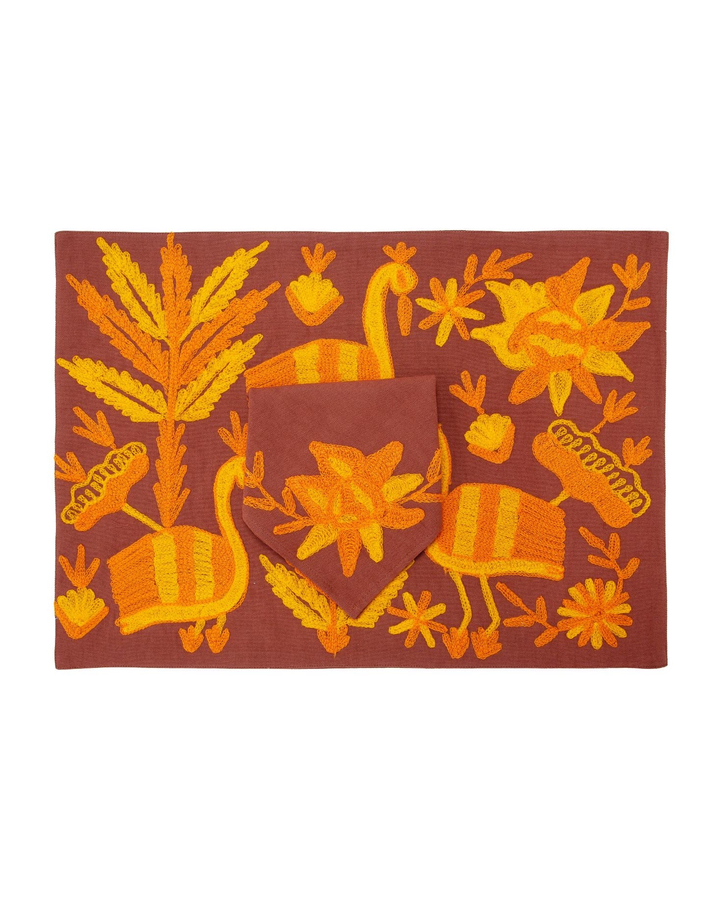 Set individual rectangular servilleta marrón con diseño bordado a mano en hilo tonos marrones y naranjas. También disponible en verde y azul.