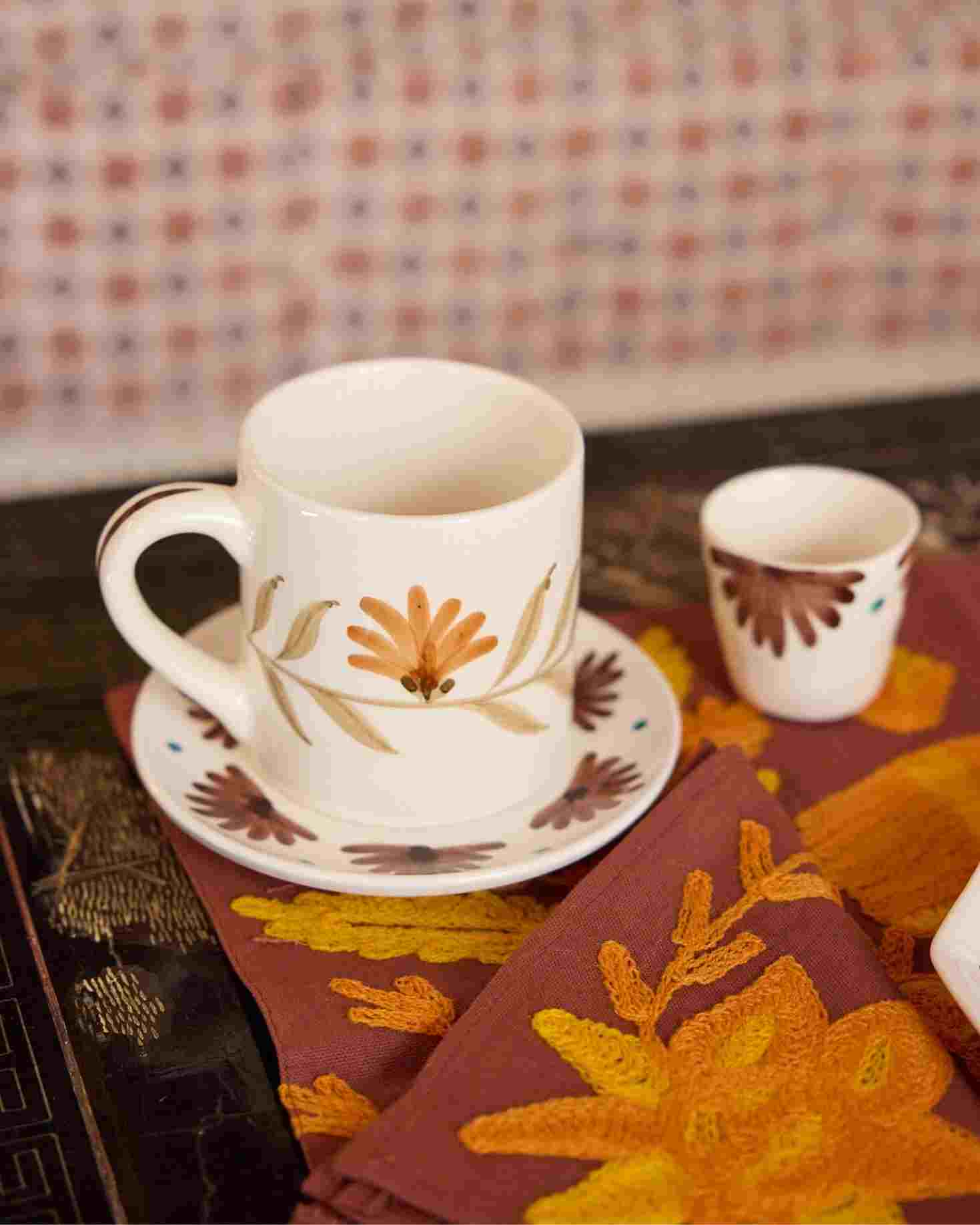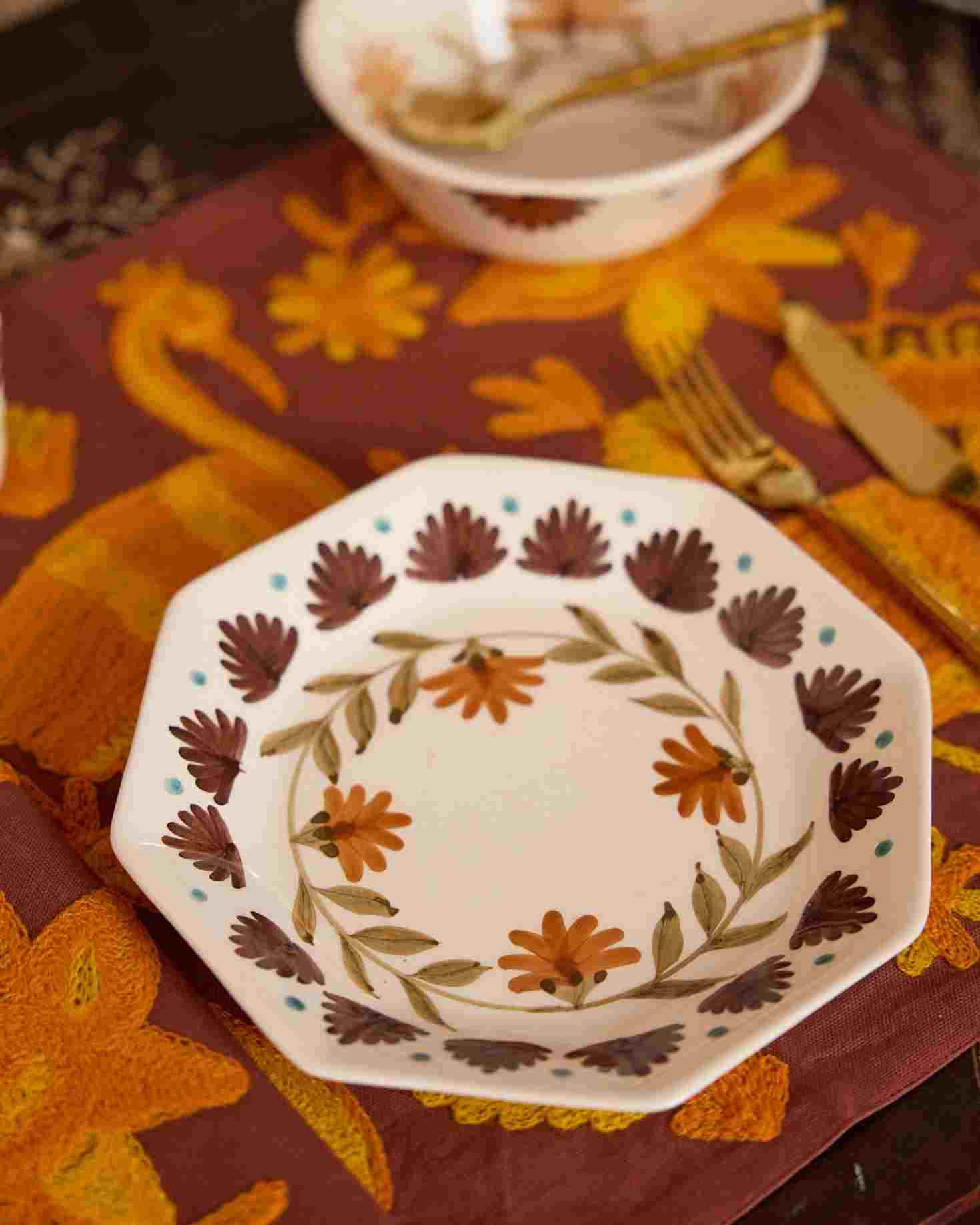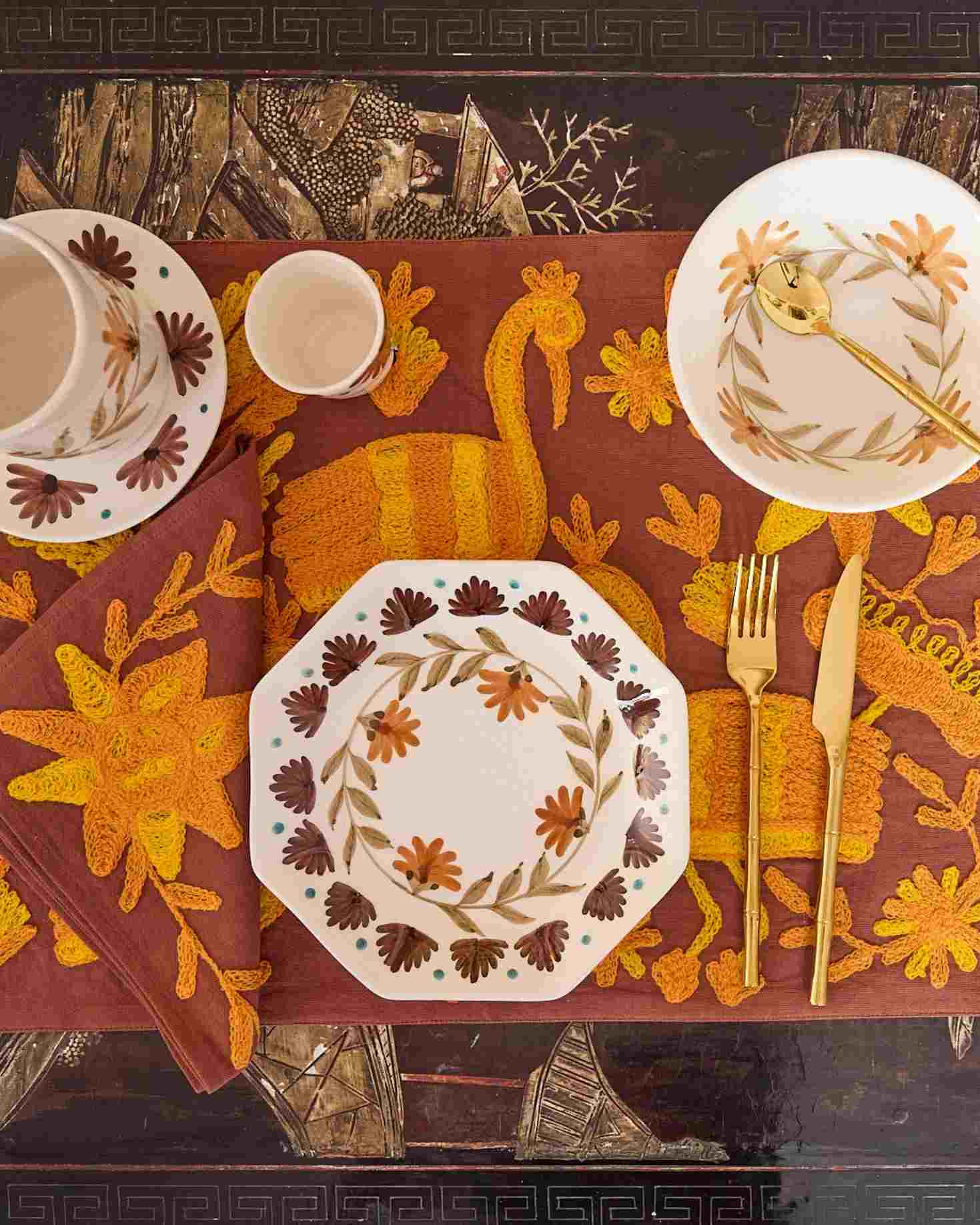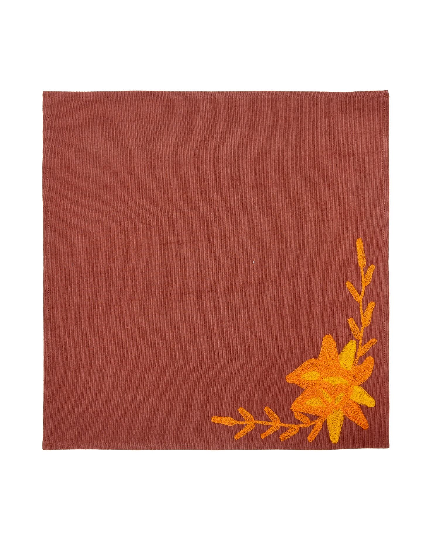 Set individual rectangular servilleta marrón con diseño bordado a mano en hilo tonos marrones y naranjas. También disponible en verde y azul.