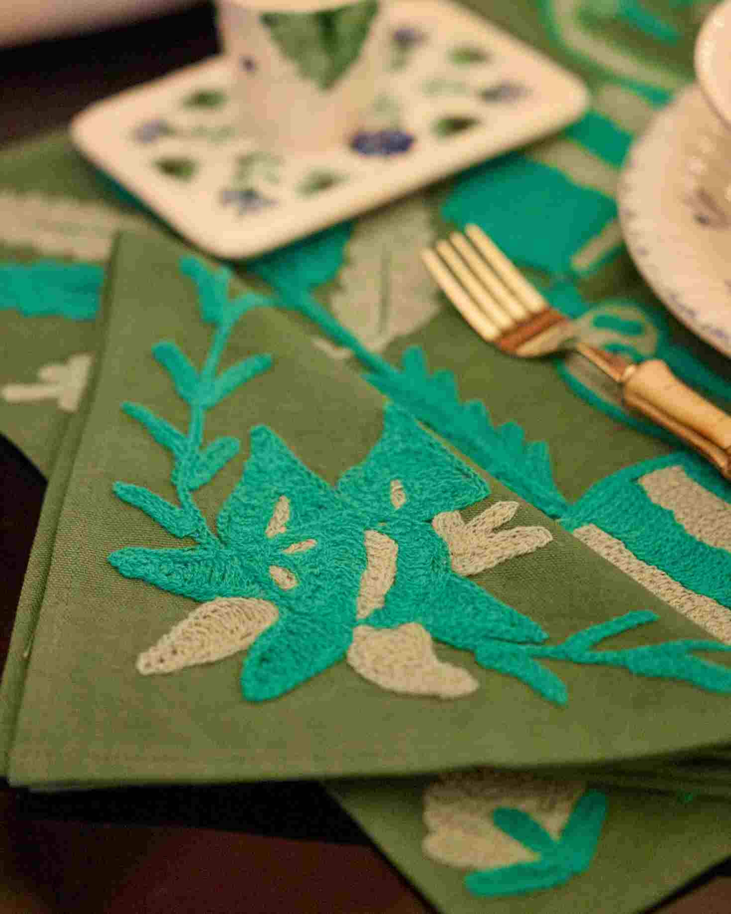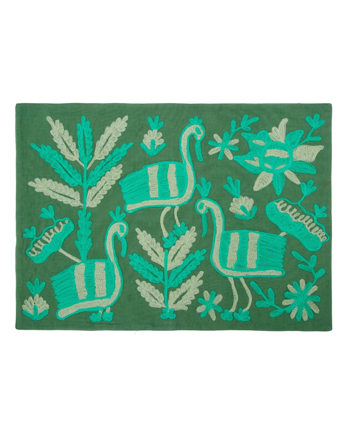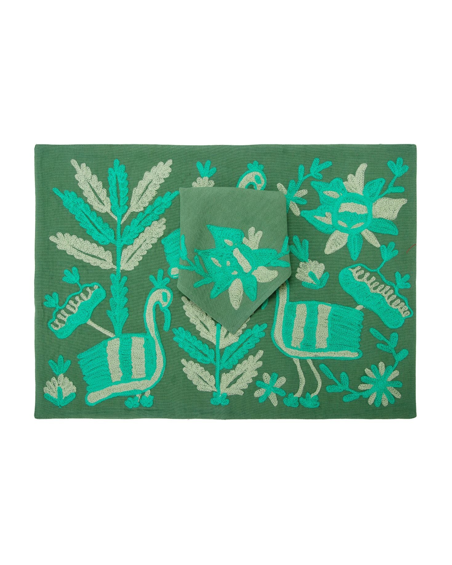 Set individual rectangular servilleta verde con diseño bordado a mano en hilo verde. También disponible en azul y marrón.