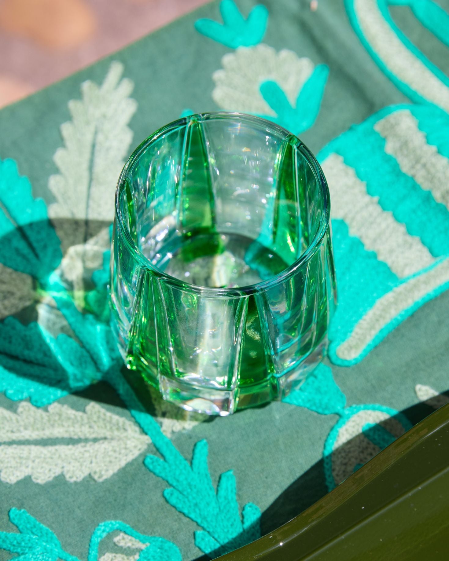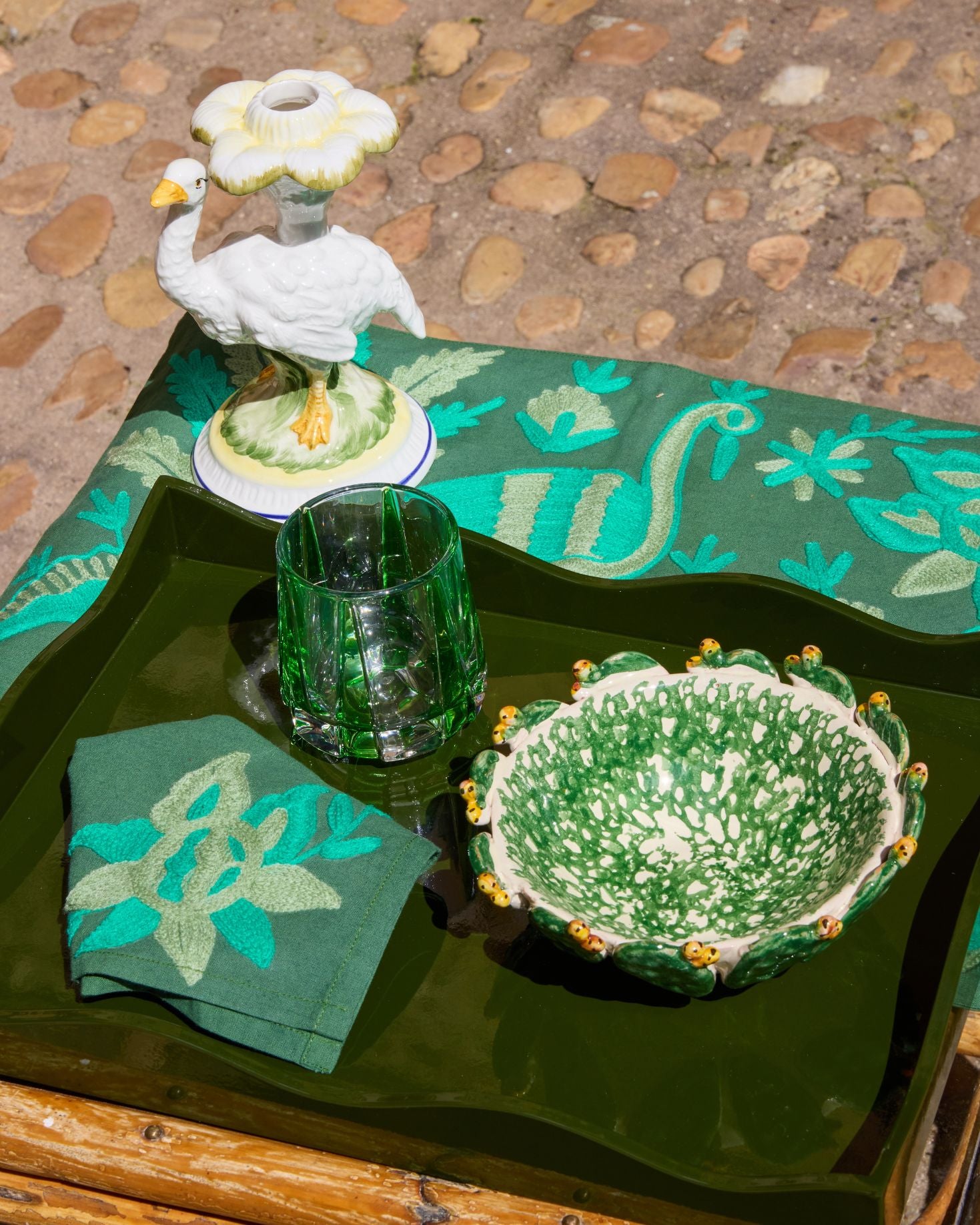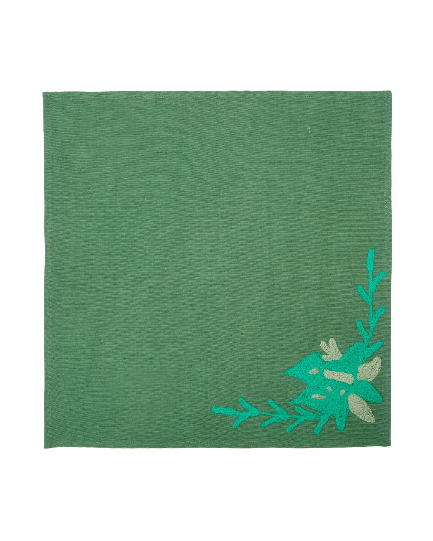 Set individual rectangular servilleta verde con diseño bordado a mano en hilo verde. También disponible en azul y marrón.