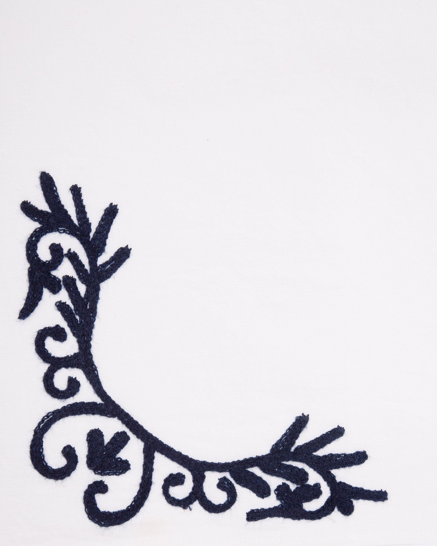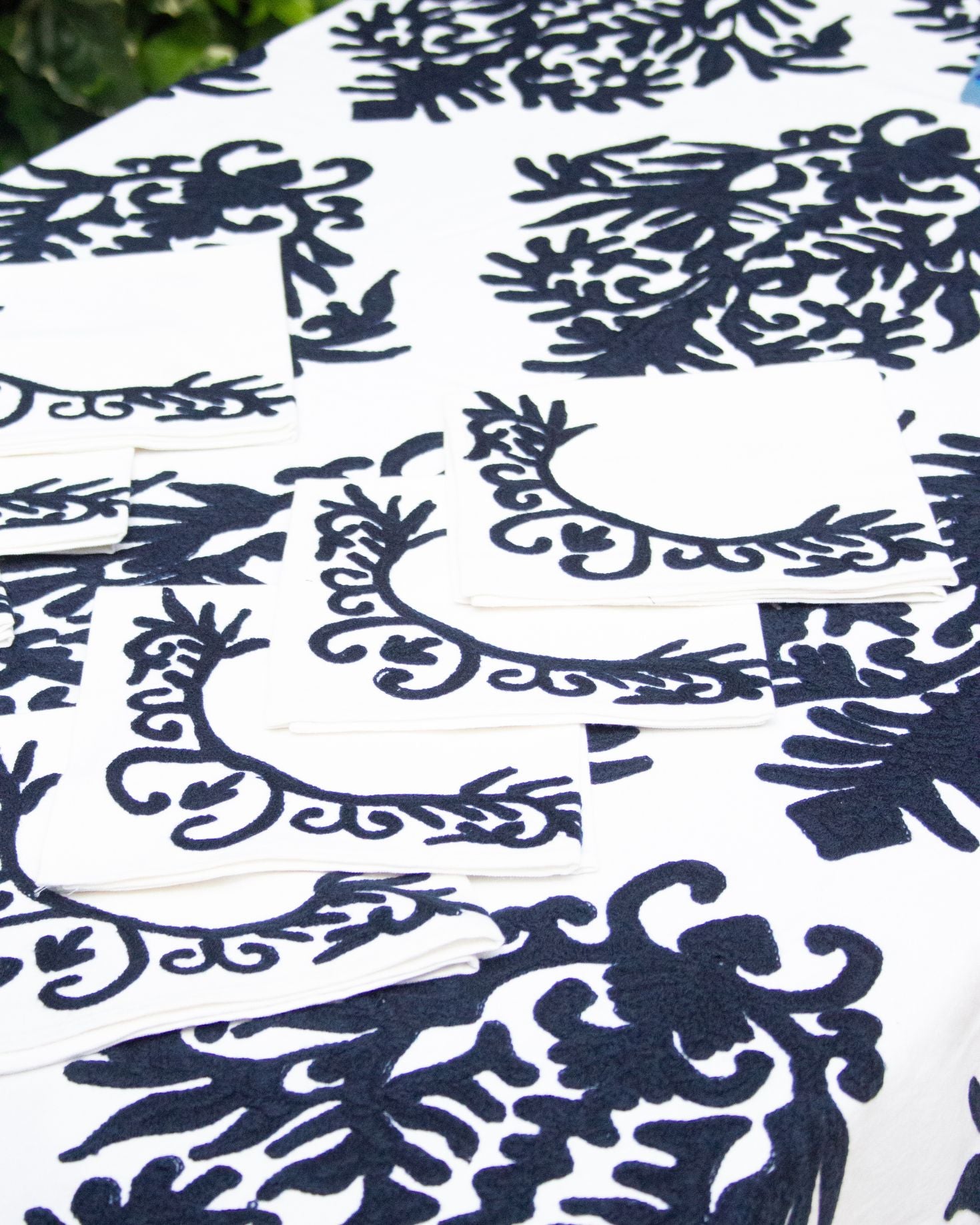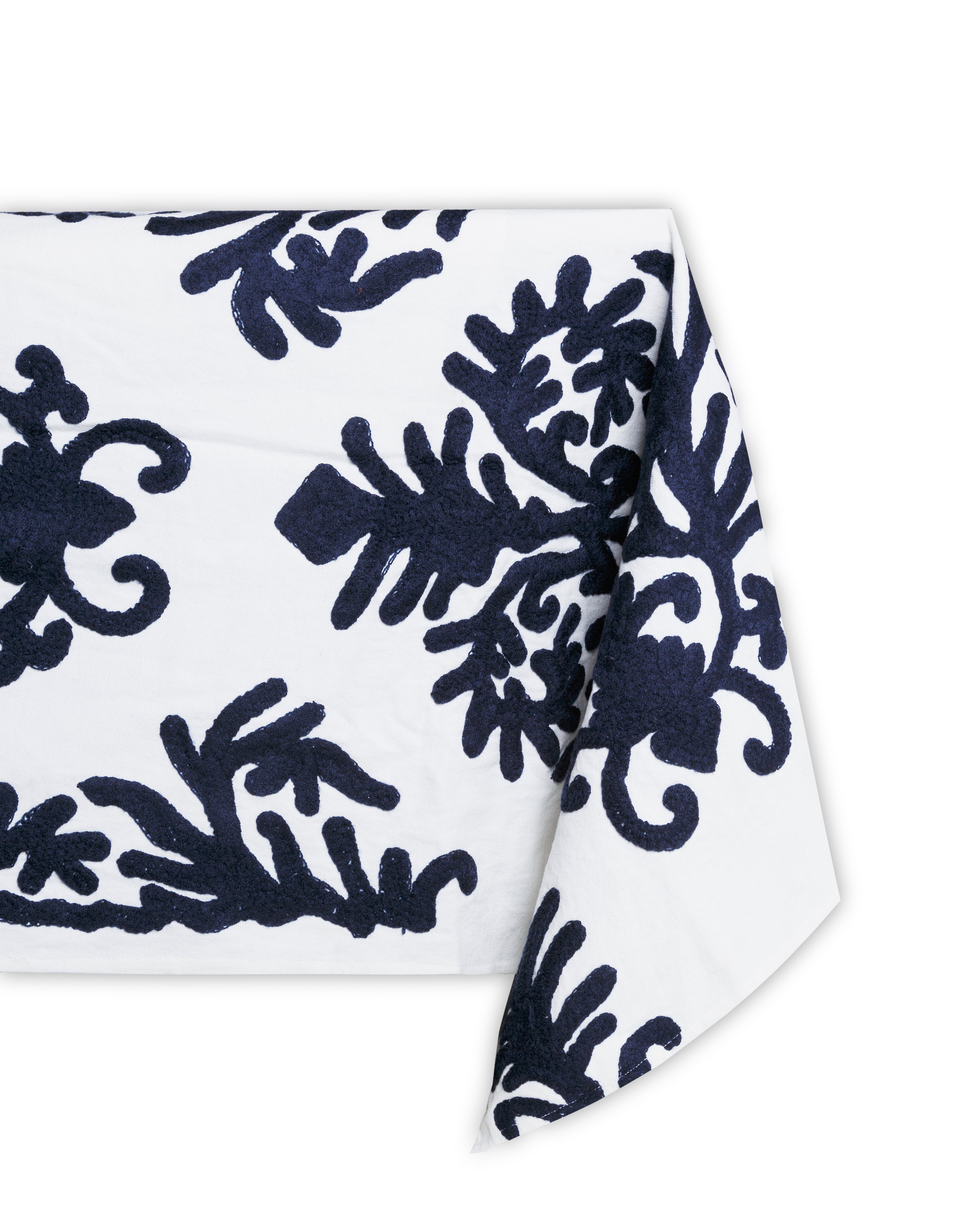 Set mantel rectangular blanco y 8 servilletas de algodón con diseño geométrico floral bordado a mano en hilo azul. También disponible en tonos marrones.
