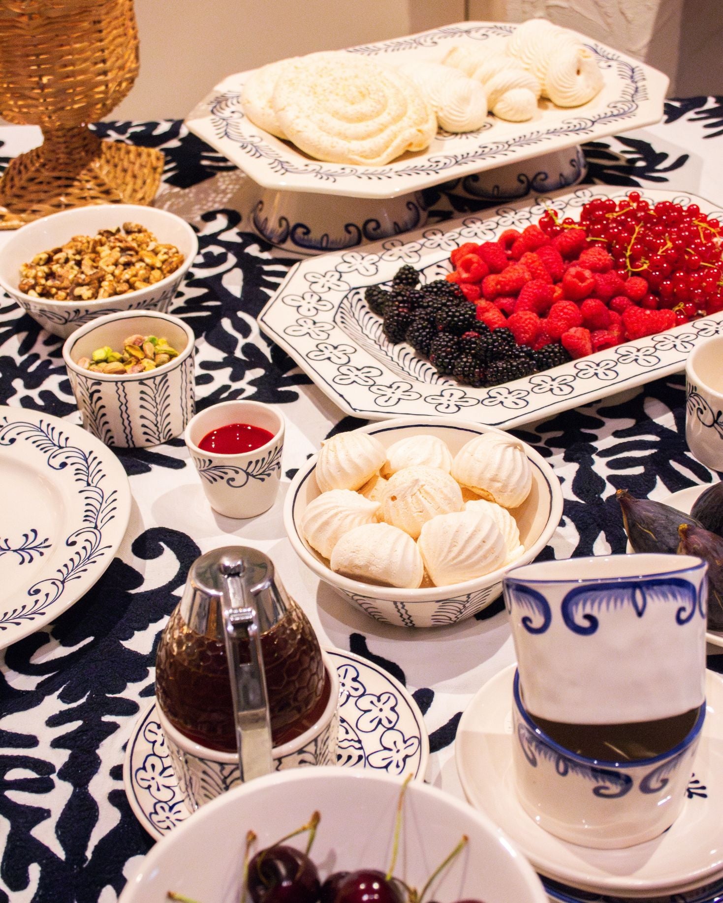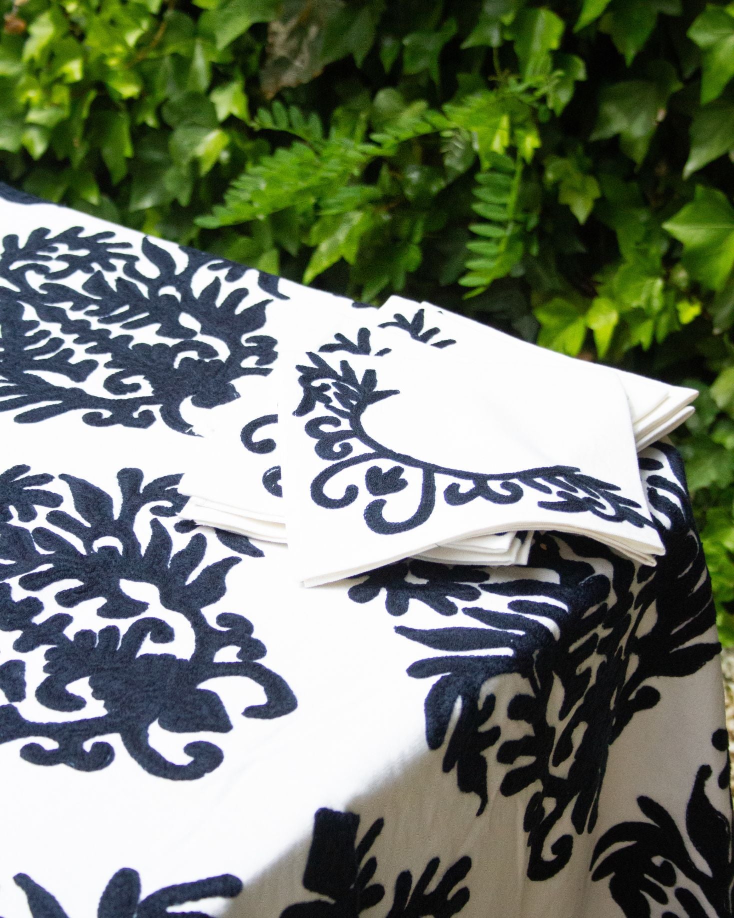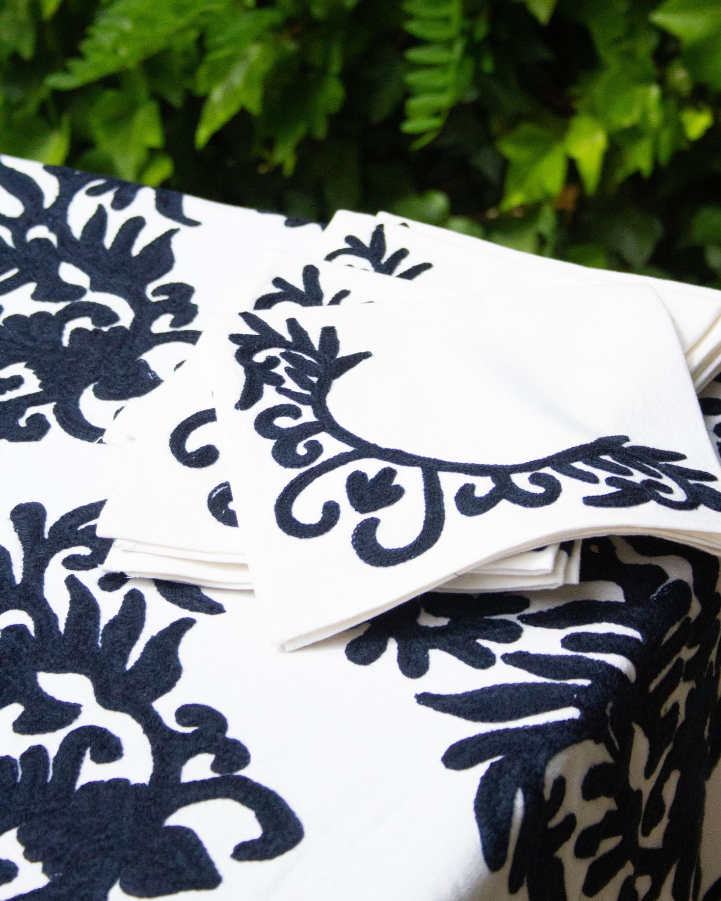 Set mantel rectangular blanco y 8 servilletas de algodón con diseño geométrico floral bordado a mano en hilo azul. También disponible en tonos marrones.