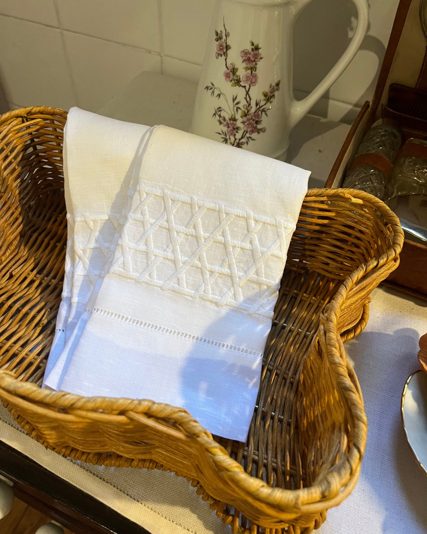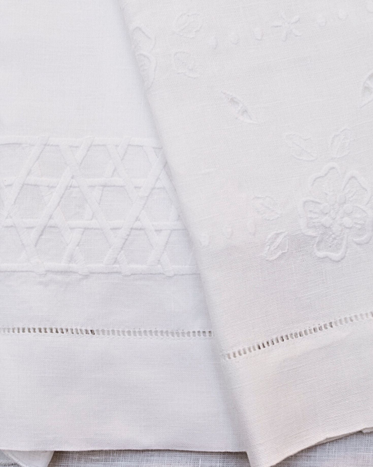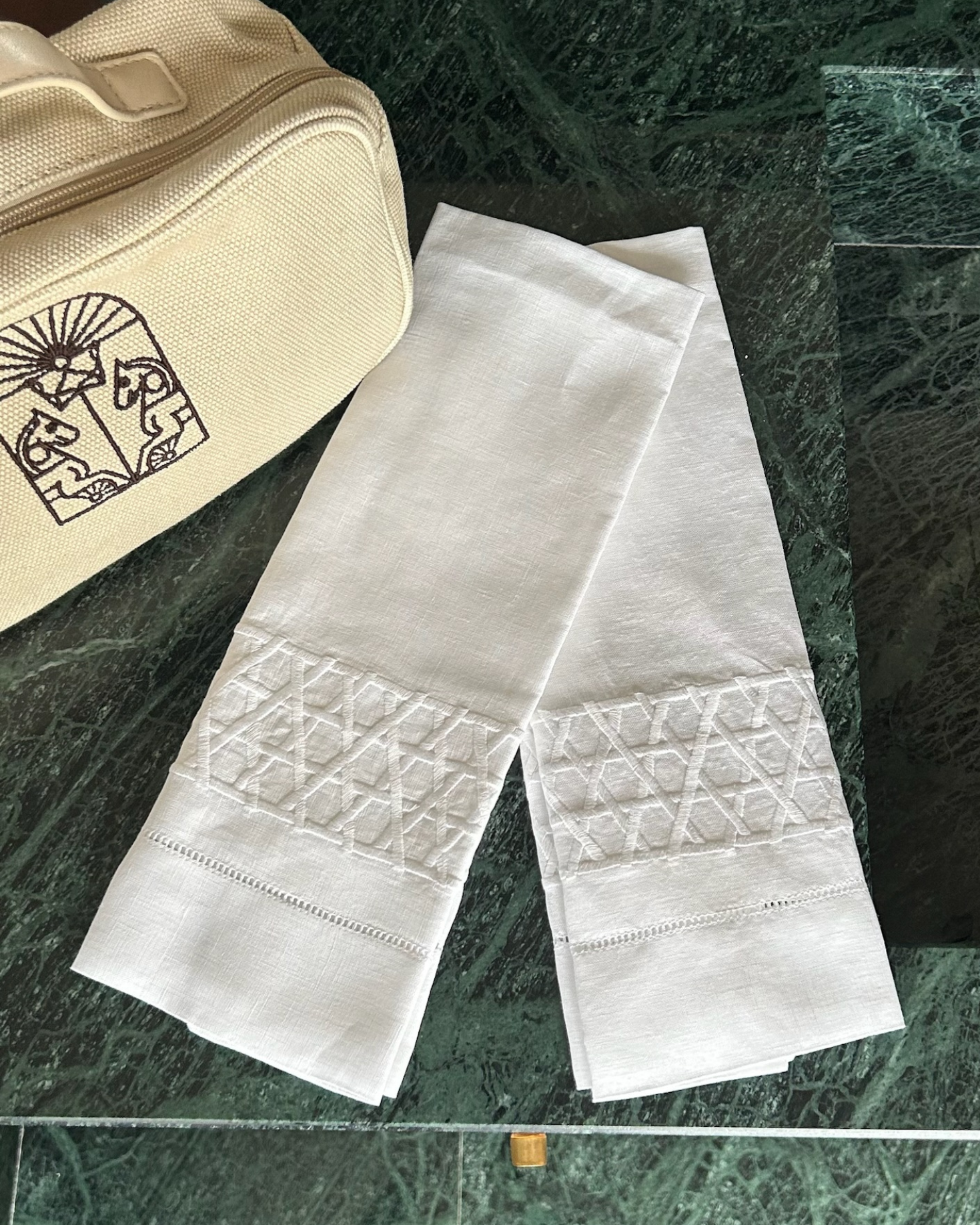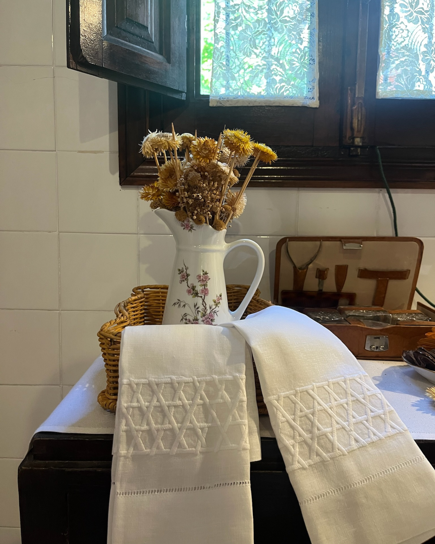 Set de dos toallas de invitado confeccionadas en hilo bordado con vainica.