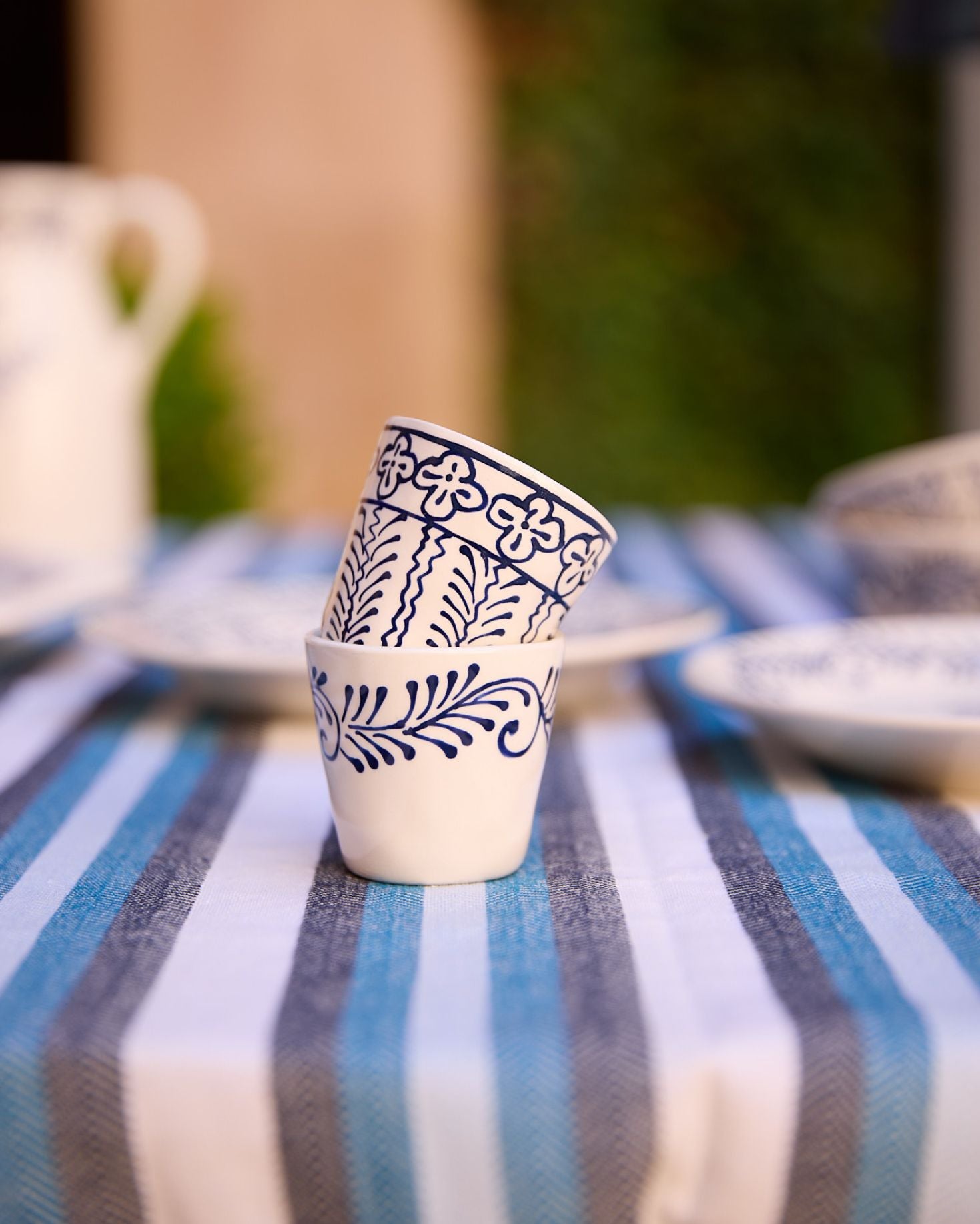 Taza espresso hecha en cerámica pintada a mano en tono azul con detalles naturales.