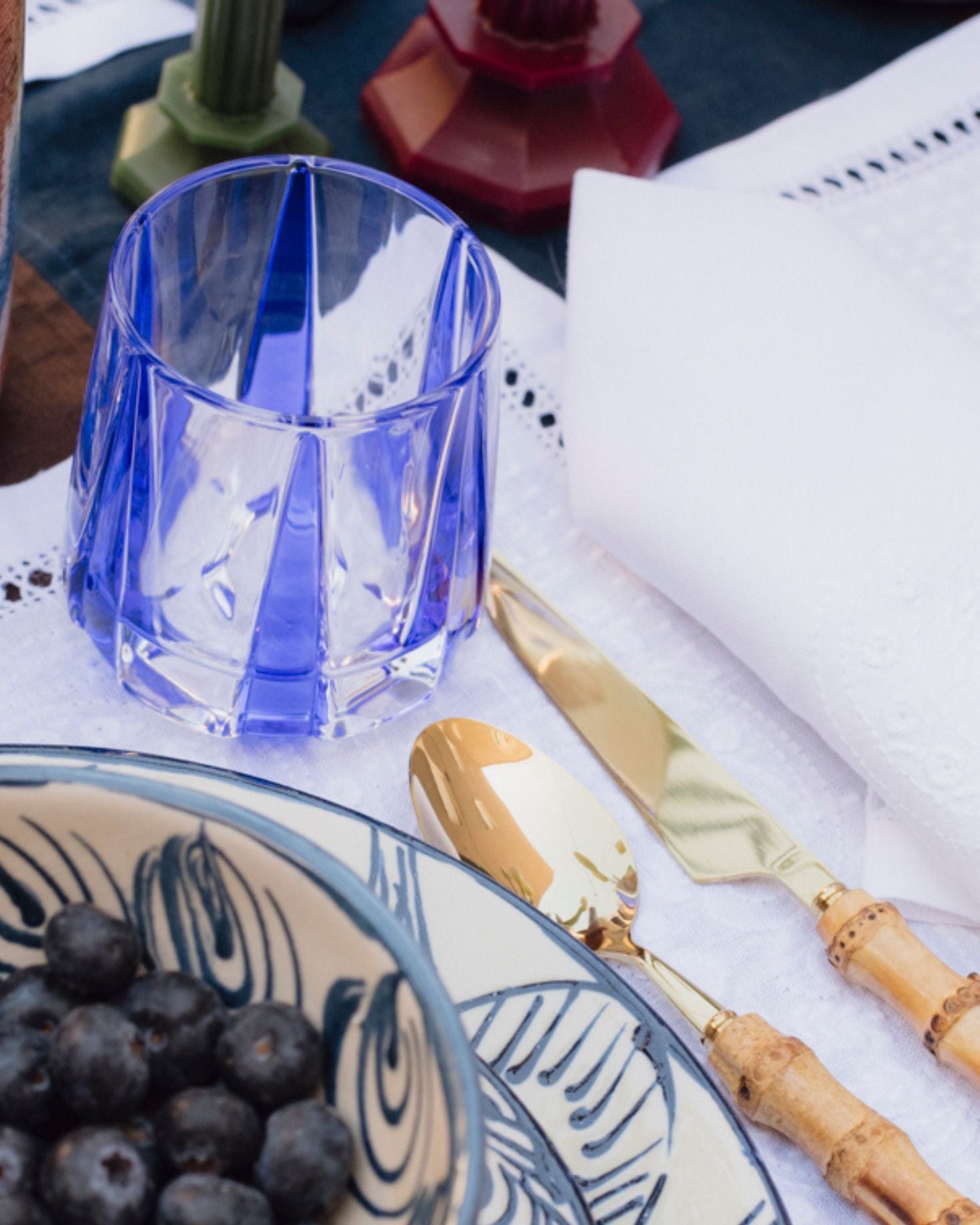 Vaso de cristal con relieve de rayas en colores negro, verde, rojo y azul.