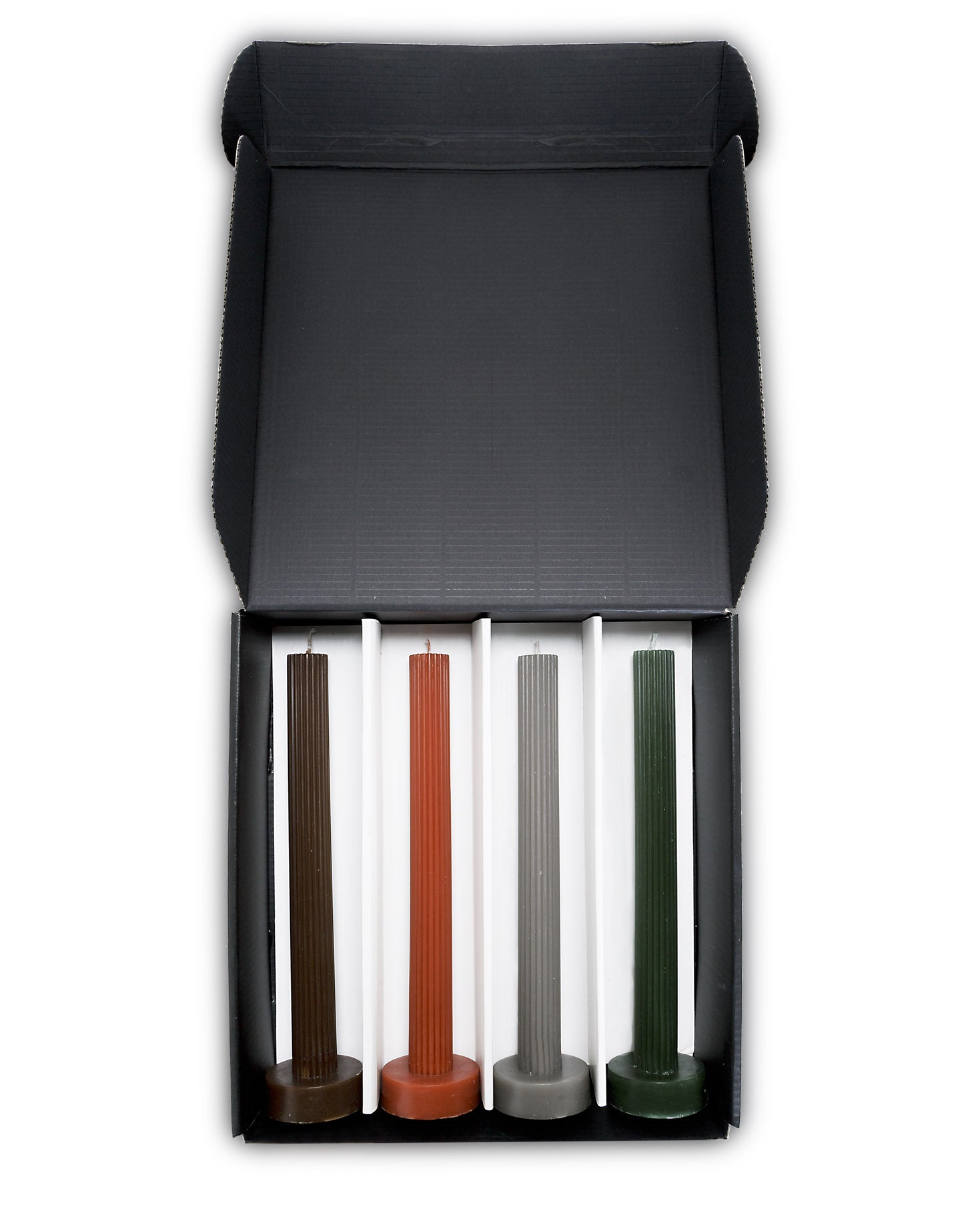 Set de cuatro velas aromáticas en diferentes tonos con el logo de IQ Home entallado en la parte de abajo. 27 cm de largo.