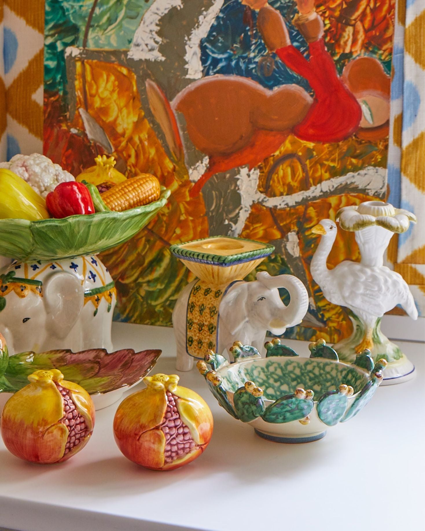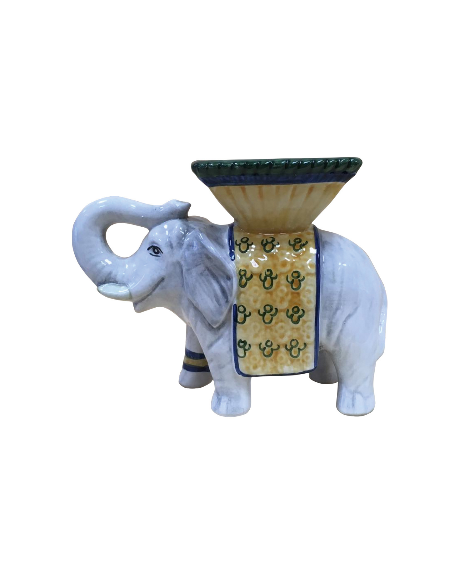Candelabro con forma de elefante, fabricado y pintado a mano en cerámica.